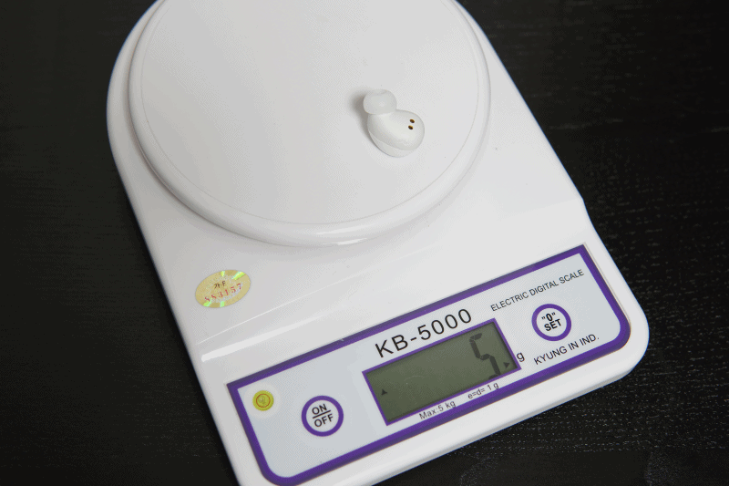 이어버드 한 개는 5g, 케이스는 54g, 전체 무게는 64g으로 측정되었습니다. 바지 주머니에도 들어가는 크기로 휴대성은 좋은 편입니다.