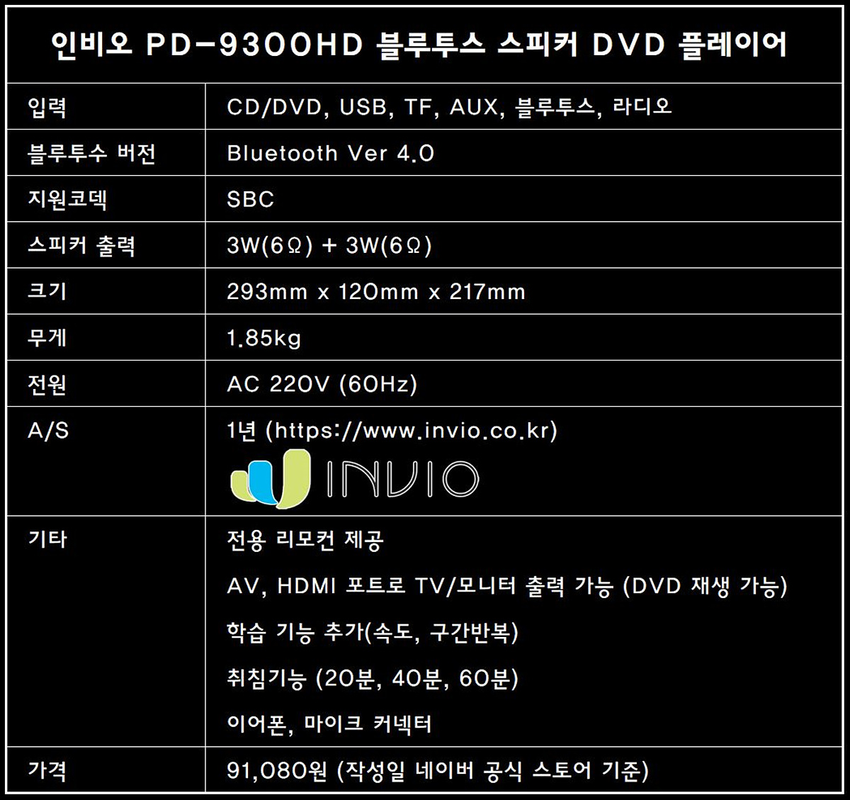 어떤 집을 갔을 때 젖병소독기, 뽀로로 매트, 작은 미끄럼틀 같은 물건이 있다면 어린아이가 있다는 걸 알 수 있죠. IT기기나 전자제품에도 이런 물건들이 있는데 오늘 소개하는 인비오 PD-9300HD CD, DVD 플레이어가 바로 이런 제품입니다. 이름에서 알 수 있듯이 CD, DVD를 재생할 수 있는 오디오(스피커)로 아이들의 언어 교육에 유용하게 사용되는 기기입니다. (이외에 추가로 다른 기능도 포함되어있습니다.)