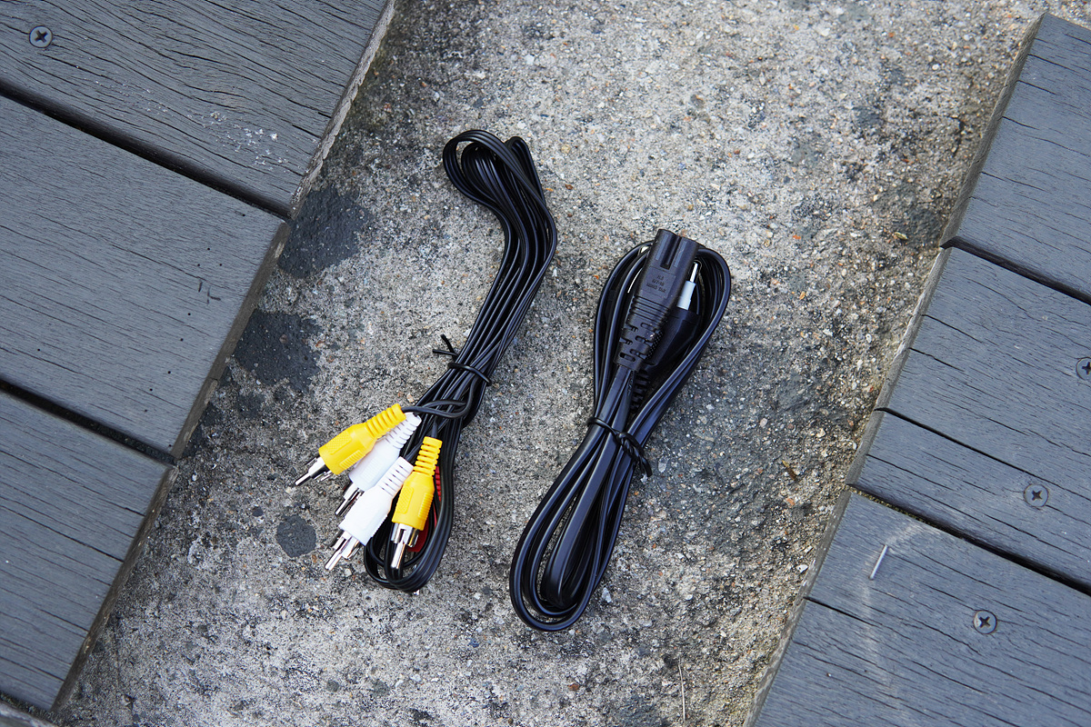 TV에 연결할 수 있는 AV 케이블과 8자형 전원 케이블입니다. 전원 케이블은 분리형이라 나중에 보관을 할 때도 편리합니다. 내부 전원은 220V 전용이므로 110V 케이블을 연결해도 사용할 수 없습니다.