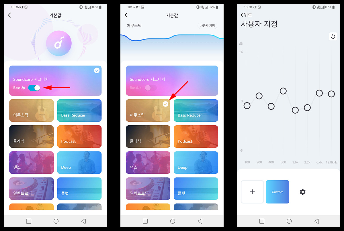 사운드코어 시그니처를 포함해서 총 21개의 프리셋이 있으며 추가로 8 채널의 사용자 EQ를 지원합니다. 저는 시그니처 사운드가 가장 좋았습니다. 기본적으로 강한 저음이 있는데 여기에 베이스 업을 하면 중저음 쪽의 양이 더 늘어나서 밸런스가 무너져서 off로 사용하는 걸 추천합니다.