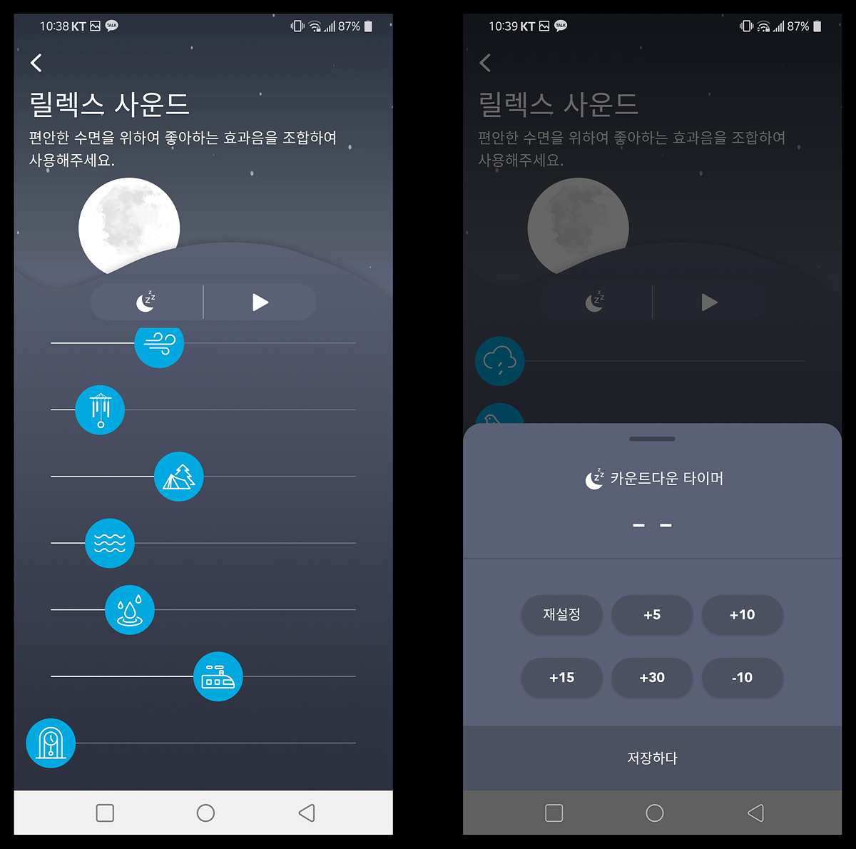 이전에는 없었던 릴랙스 사운드(ASMR) 기능이 추가되었습니다. 바람 소리와 파도 소리를 조금씩 넣으니 바닷가에 온 것 같은 느낌이었습니다. 소리의 조절과 타이머(시간)도 조절할 수 있습니다. 잠들기 전에 사용하라는 용도인 거 같은데 저는 학생들이 공부할 때 더 잘 맞을 거 같았습니다.