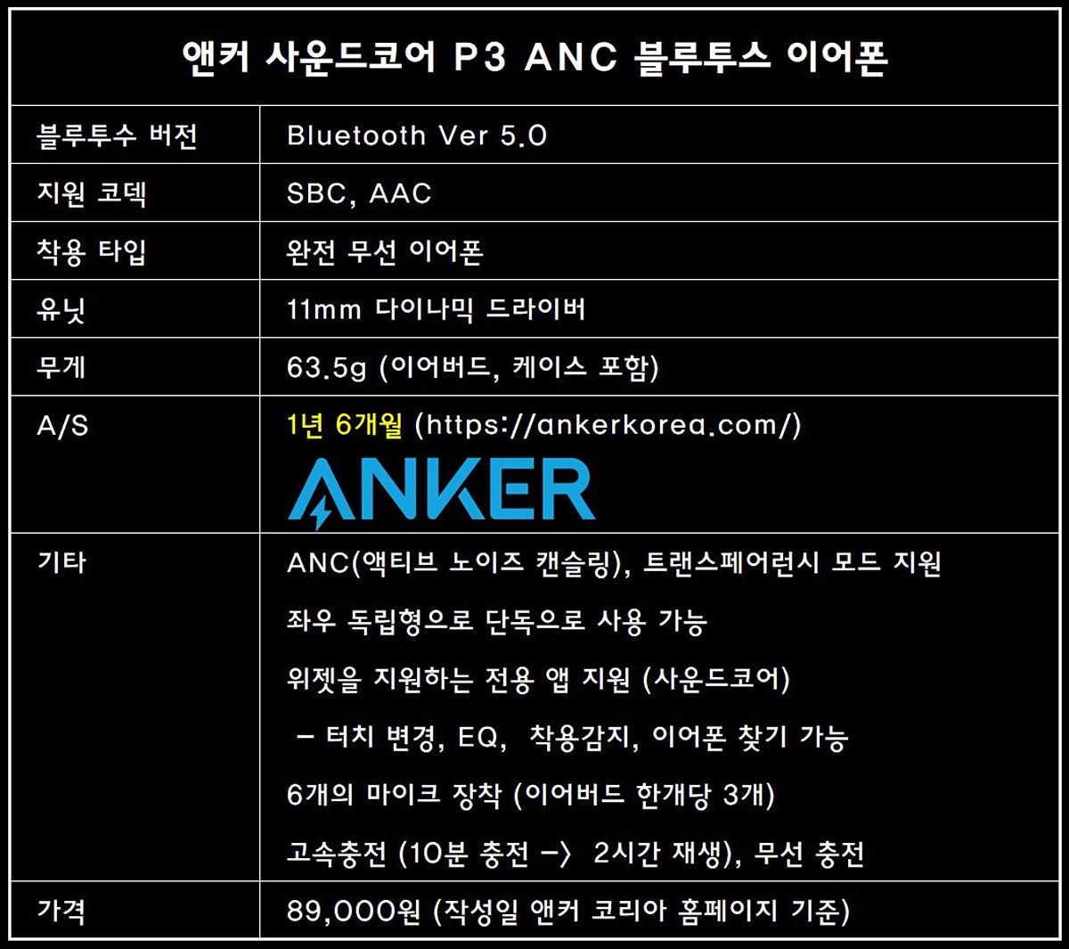 앤커 라이프 P3 ANC의 스펙을 간단히 정리해보았습니다. 무선 충전 지원과 마이크가 한 개씩 더 추가가 되었다는 점을 제외한다면 라이프 닷2 ANC와 큰 차이점은 없었습니다. 기존 닷2 ANC에서 아쉬웠던 부분이 무선충전이었는데 이게 해결되었으니 어찌 보면 단점으로 지적할만한 부분들이 없다고 할 수 있겠군요. 8개월이 지난 지금은 어떤 부분들이 달라졌을지 자세하게 살펴보도록 하겠습니다.