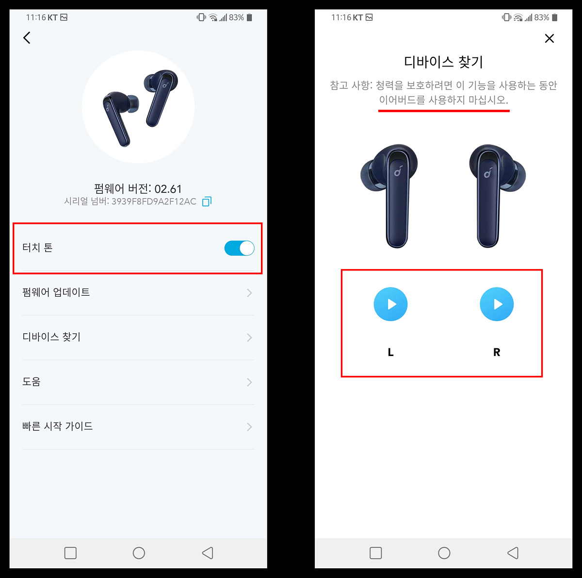 터치 톤은 재생이나 트랙 이동과 같은 기능을 실행하면 소리로 안내를 해줍니다. 디바이스(이어 버드) 찾기는 좌우 따로 실행할 수 있으며 상당히 높은 주파수(고음)가 출력되므로 귀에 착용한 상태에서 사용하시면 안 됩니다. 이어 버드가 멀리 있을 때는 힘들겠지만 방이니 근처에 있을 때 유용한 기능입니다.