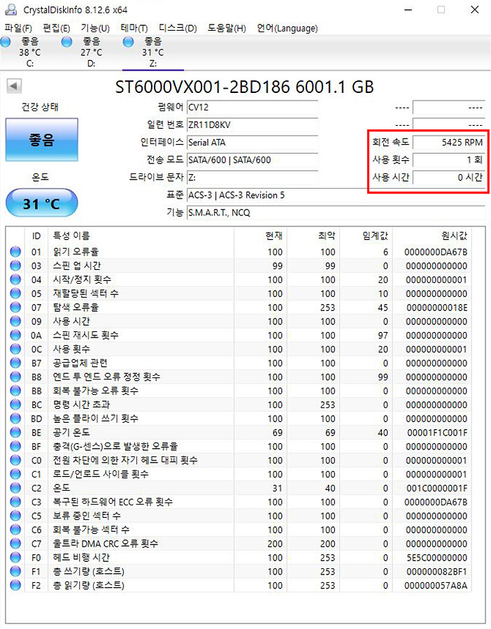 Crystal Disk Info를 통해 현재 HDD의 스펙과 상태를 확인할 수 있습니다. 소개에서 언급을 했듯이 이 제품은 7,200이 아닌 5,400rpm 제품입니다.