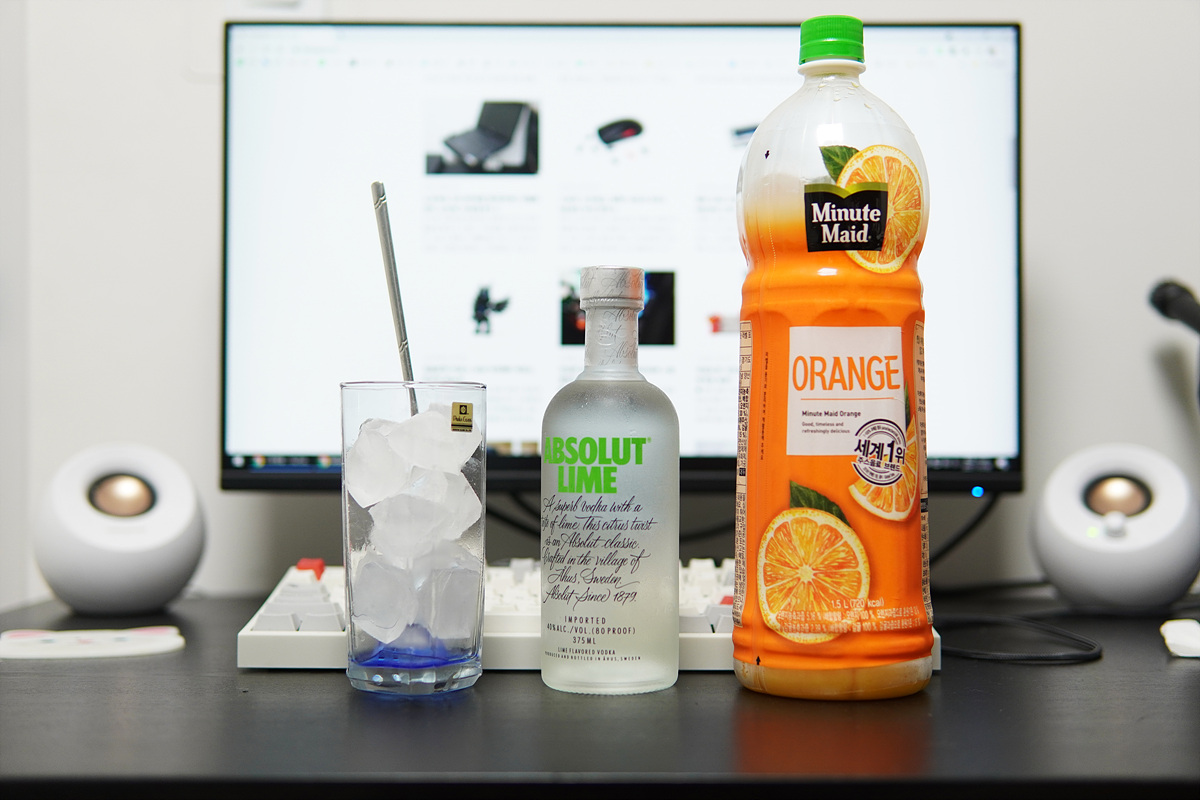 얼마전에 마트에가서 사온 보드카입니다. 요즘 갑자기 술에 꽂혀서 이것저것 사고 있네요. 그냥은 먹을 수 없으니 칵테일로 만들 재료(얼음, 오렌지주스)도 준비했습니다.