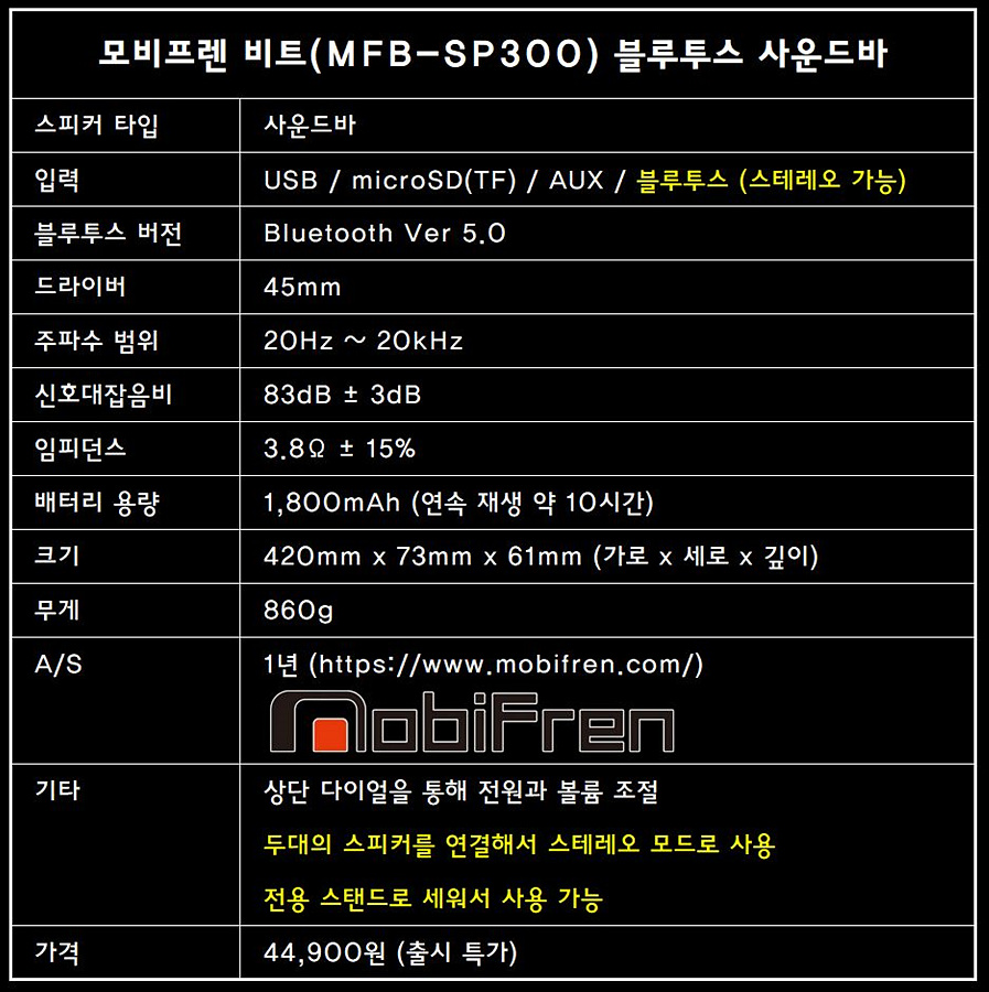 ◆ 모비프렌 비트(Beat) 블루투스 사운드바 음성 안내