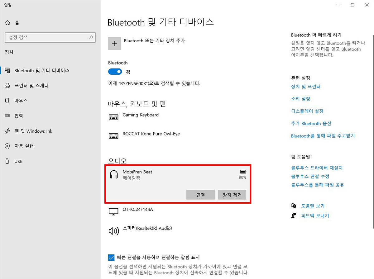 2채널의 스피커처럼 사용하기 위해서 스마트기기 아닌 PC와 연결을 했습니다. 메인보드의 무선 모듈을 이용해도 되고 USB 동글을 사용 해도 됩니다. 비트 블루투스 사운드바를 스테레오 방식으로 연결하기 위해서는 두 개 모두 블루투스 모드로 둔 상태에서 메인이 될 기기의 모드 버튼을 2초간 누르고 있으면 끝~입니다. (참 쉽죠) 스피커 두 개가 연결이 되면 띠링~~ 띠링~~ 하는 소리로 확인을 할 수 있습니다. 설명서에는 LED가 깜박거린다고 되어있지만 계속 켜진 상태로 동작합니다.