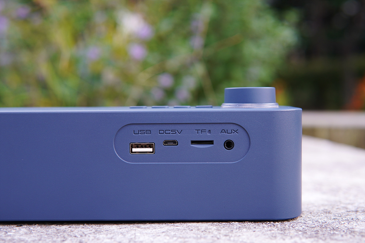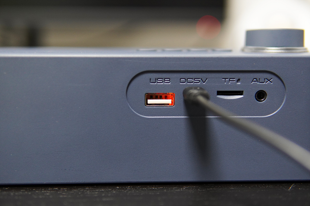 왼쪽부터 USB, 충전, TF(microSD), 3.5mm Aux 단자가 있습니다.