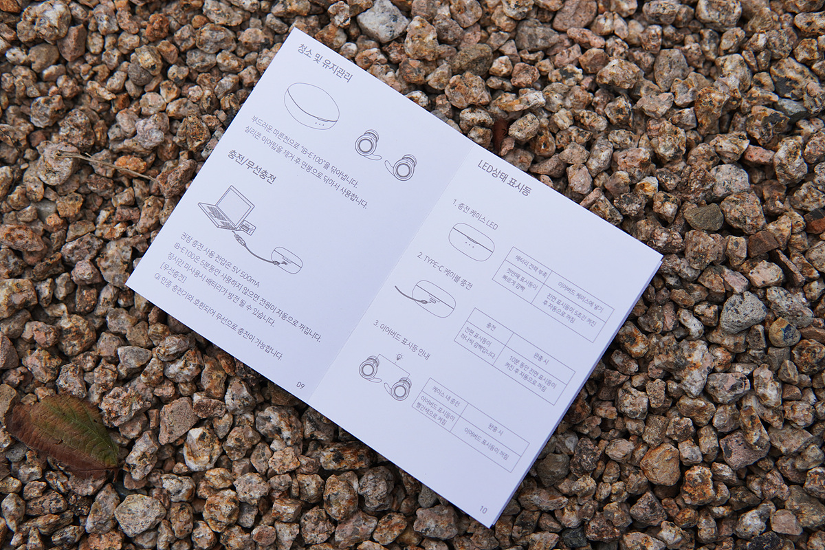 설명서는 한글로 제품의 기능이 설명되어 있습니다. IB-E100은 터치 방식으로 기능을 조절할 수 있는데 설명서에는 이 터치 부분에 대한 설명이 전혀 없더군요. 가장 중요한 부분인데 왜 이걸 생략했는지 모르겠습니다. 터치 센서에 대한 기능은 제품의 판매 페이지에만 설명되어 있습니다.