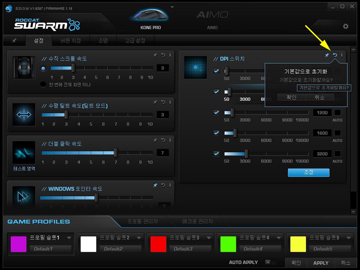로켓 스웜은 조금 복잡해보이지만 조금만 익숙해지만 편리한 기능들이 많이 있습니다. 화살표 부분을 누르면 해당 기능이 초기화가 됩니다. 저는 이 부분을 특히 좋아합니다. 보통은 기능 전체를 초기화해야 되지만 스웜은 각각의 기능마다 따로 초기화를 할 수 있습니다.