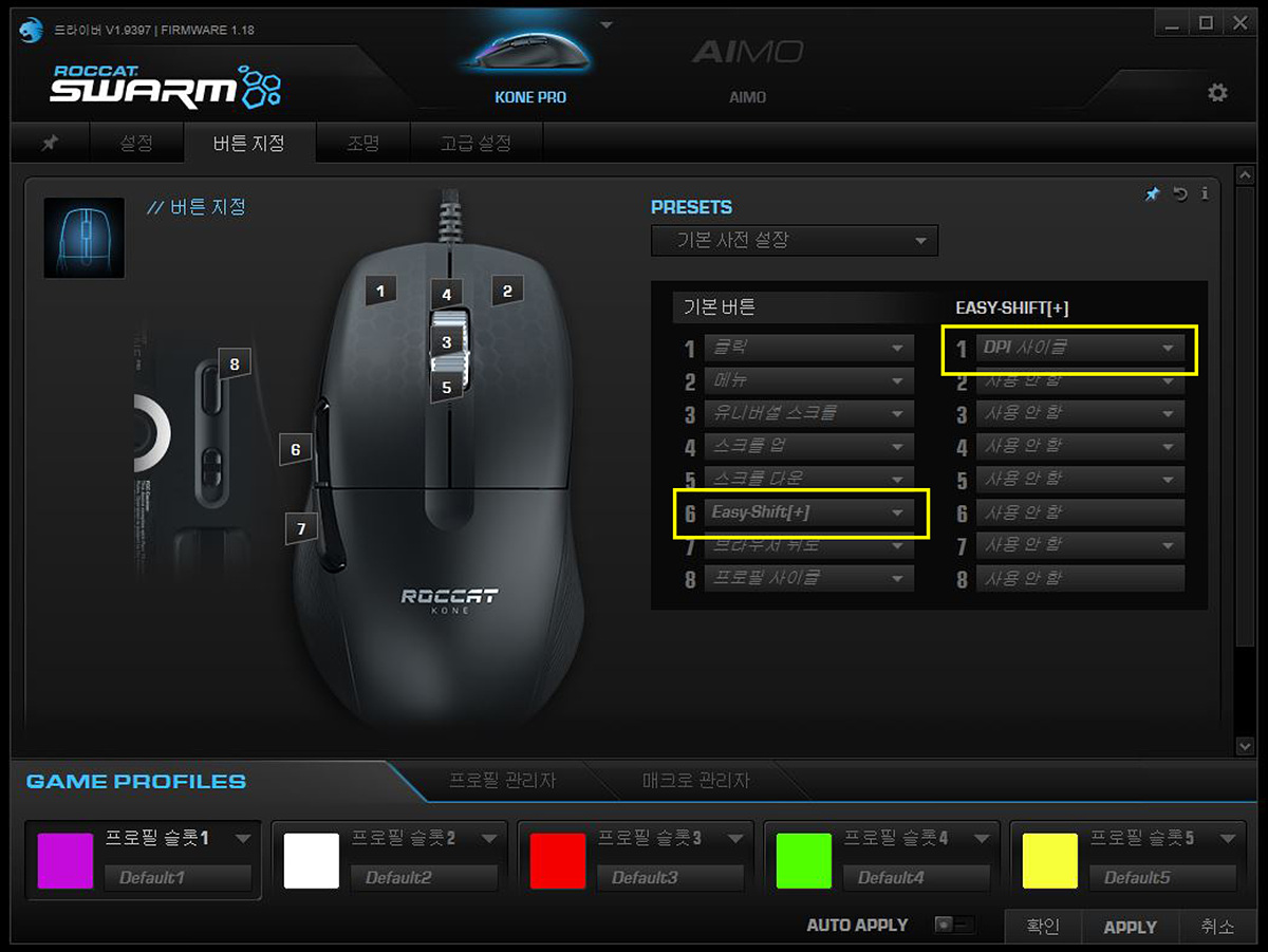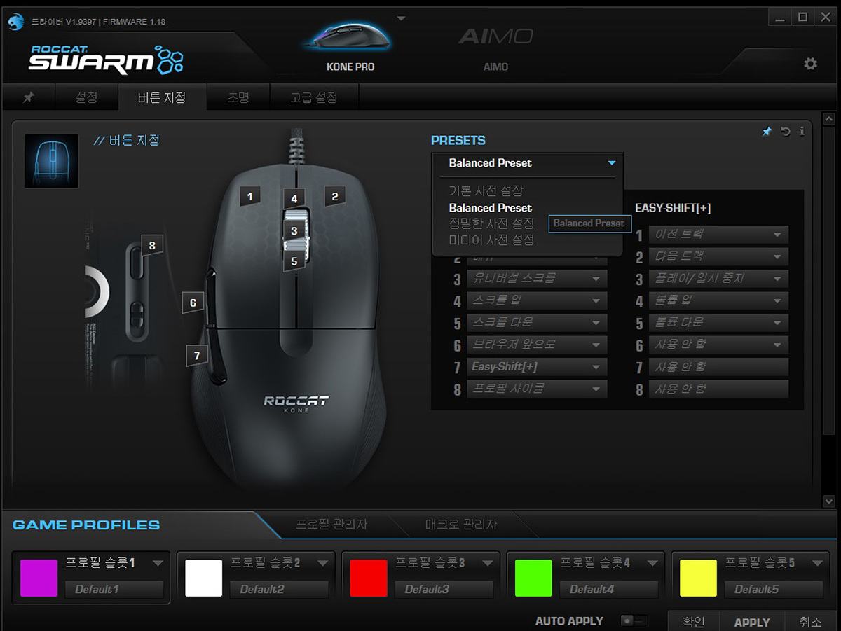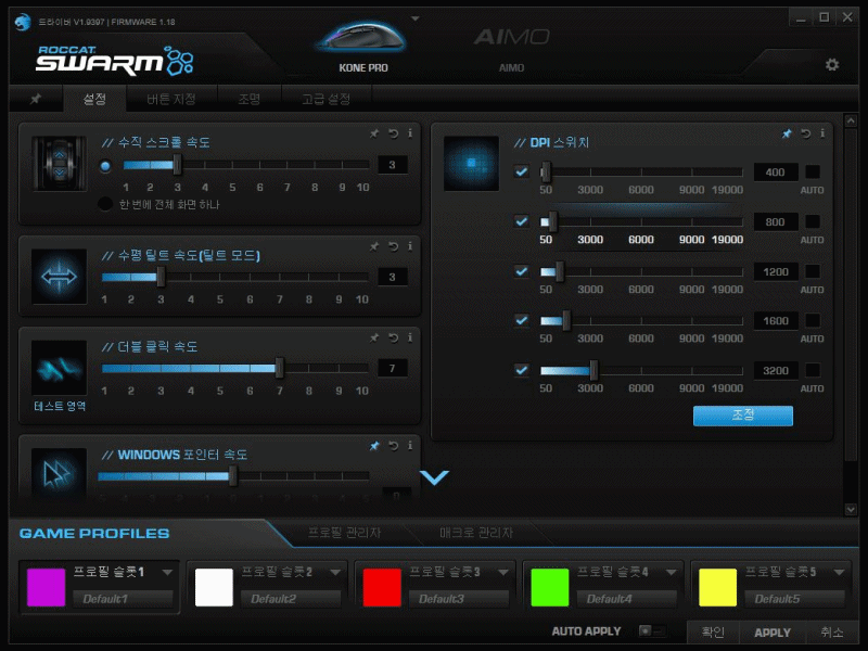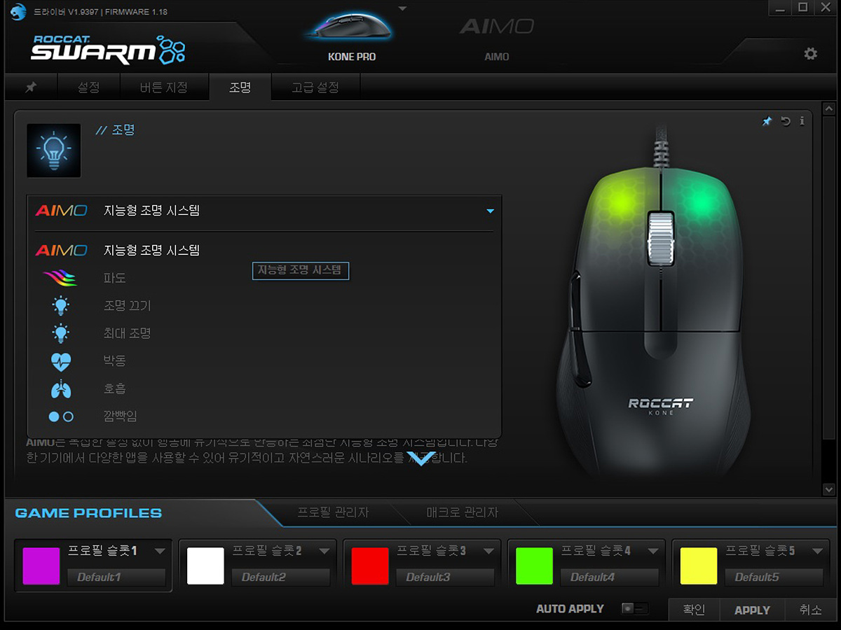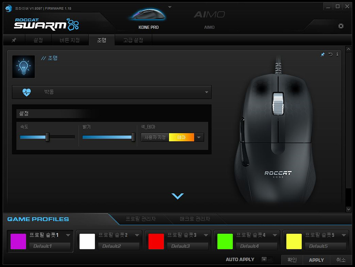 설정 / 버튼 지정 / 조명/ 고급 설정 4개의 탭으로 이루어져 있습니다. 아랫쪽에는 5개의 프로필이 있으며 마우스 바닥에 있는 버튼을 누르면 순서대로 바뀝니다.