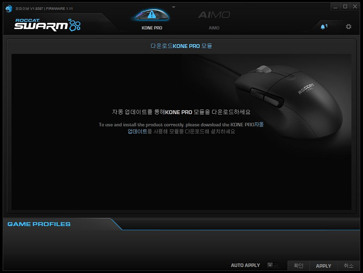 프로그램을 설치하면 자동으로 콘 프로를 인식한 뒤 모듈 다운로드의 안내를 합니다. 다른 제품들과 조금 다르게 로켓의 제품들은 각각의 모듈로 인식을 하게 됩니다.