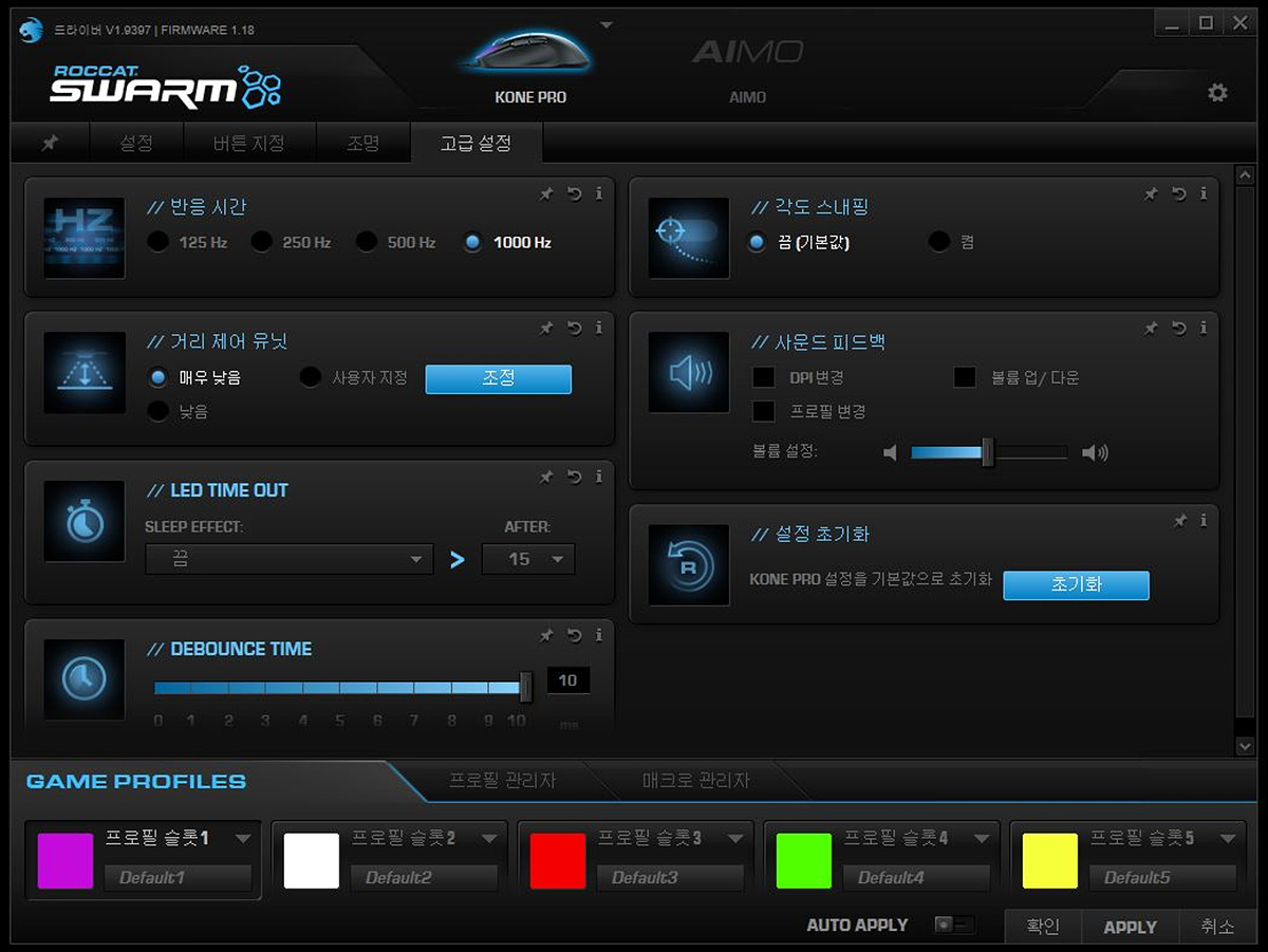 폴링레이트와 여러가지 기능들을 조절할 수 있으며 마우스 전체 기능을 초기활 할 수 있습니다. 위 사진에서 거리 제어 유닛은 LOD (Lift Off Distance) 기능입니다.