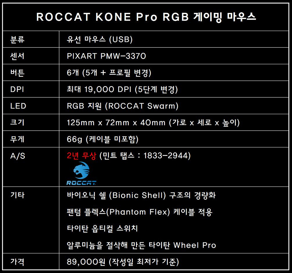 픽스아트의 PMW-3370을 사용해서 센서만을 따진다면 최상급의 심장을 갖고 있다고 할 수 있습니다. 콘 프로의 가격은 89,000원으로 유선이라는 점을 생각한다면 다소 비싼 편입니다. 새로운 쉘과 여러가지 기능들이 이런 가격에 맞는지 좀 더 자세하게 살펴보도록 하겠습니다.