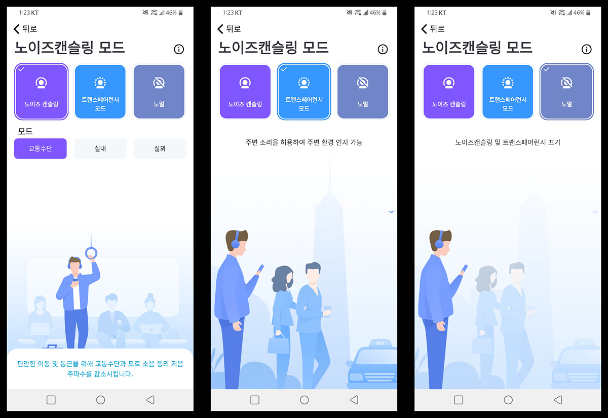 노이즈 캔슬링 모드는 3가지로 설정할 수 있습니다. 일반적인 음악을 듣는 상황에서는 트랜스페어런시나 노멀 모드보다 노이즈 캔슬링을 사용하는 걸 추천합니다.