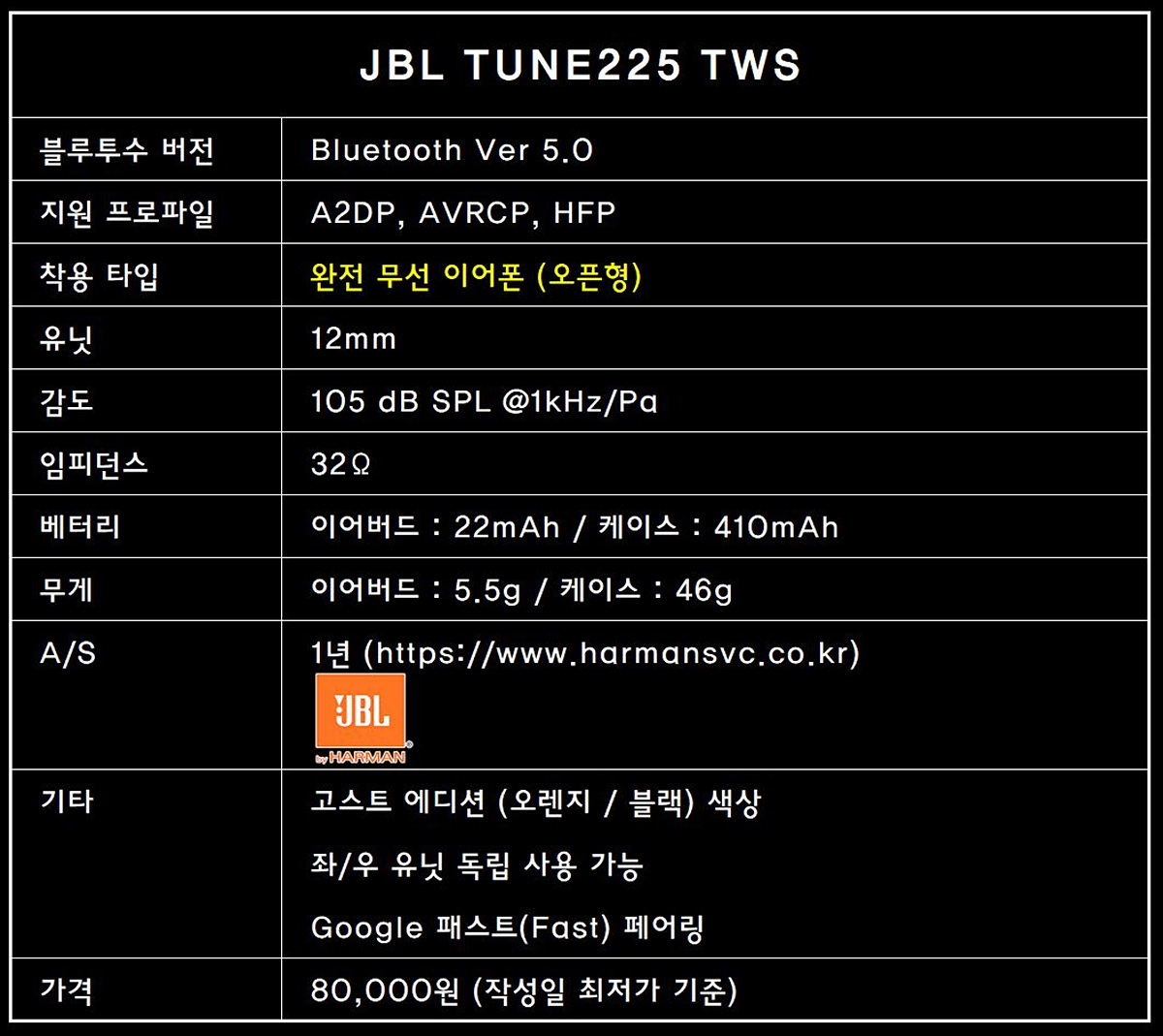 JBL TUNE225 TWS 이어폰의 스펙을 간단하게 정리해보았습니다. 제가 소개하는 제품은 화이트지만 TUNE225의 또 다른 특징은 바로 컬러입니다. 오렌지, 블랙은 고스트 에디션이라고 부르는 투명 재질로 조금은 독특한 하우징을 가지고 있습니다. 특히나 오렌지 컬러는 JBL을 상징하는 색이라서 더욱 눈에 띄지만 40대 아재인 저에게는 꽤나 부담이 되더군요. 1-20대 젊은 사용자들이라면 도전(?) 해도 좋을 거 같습니다.