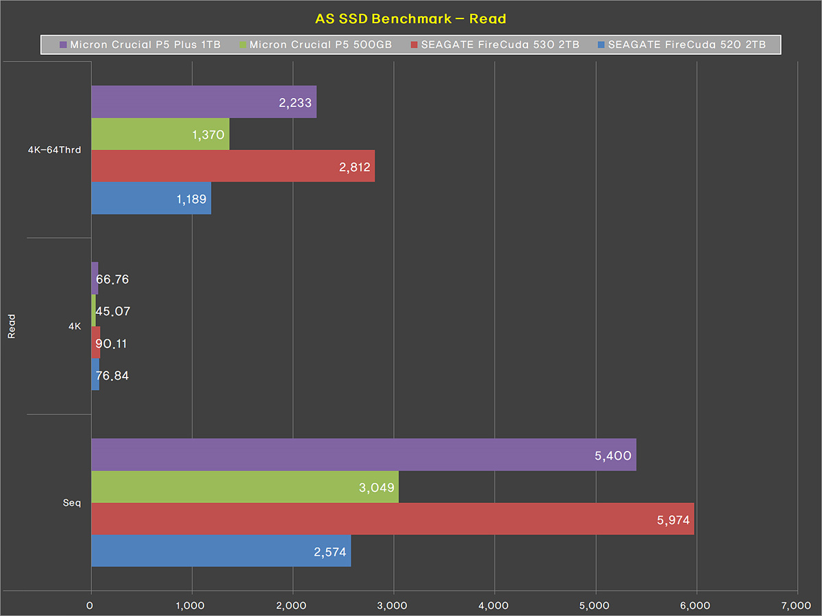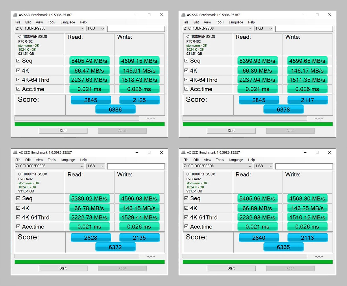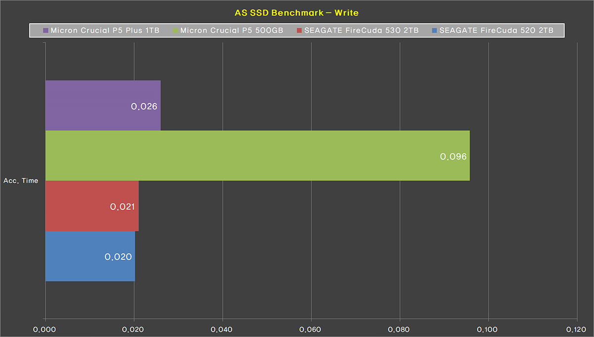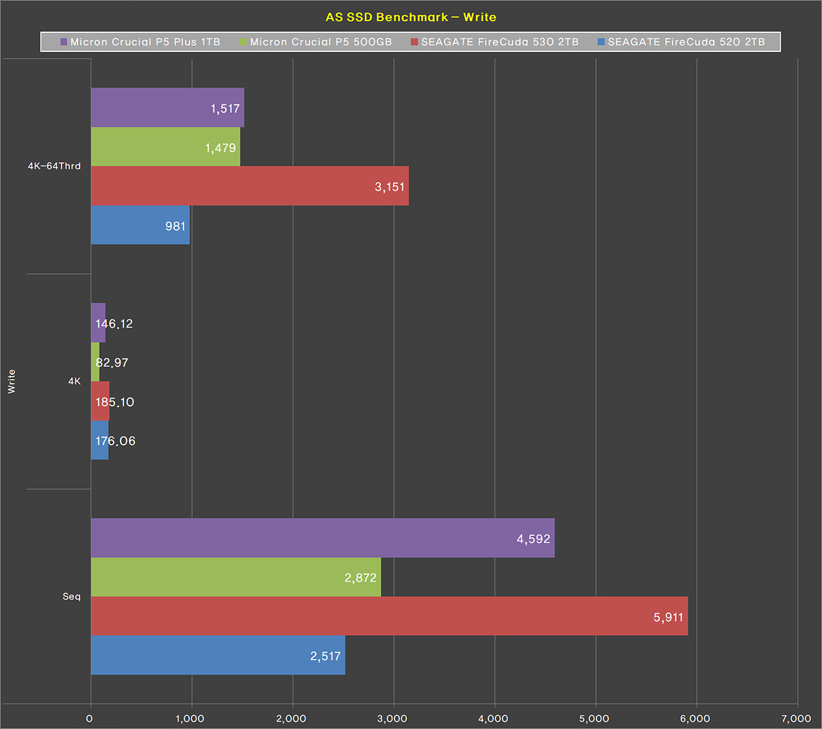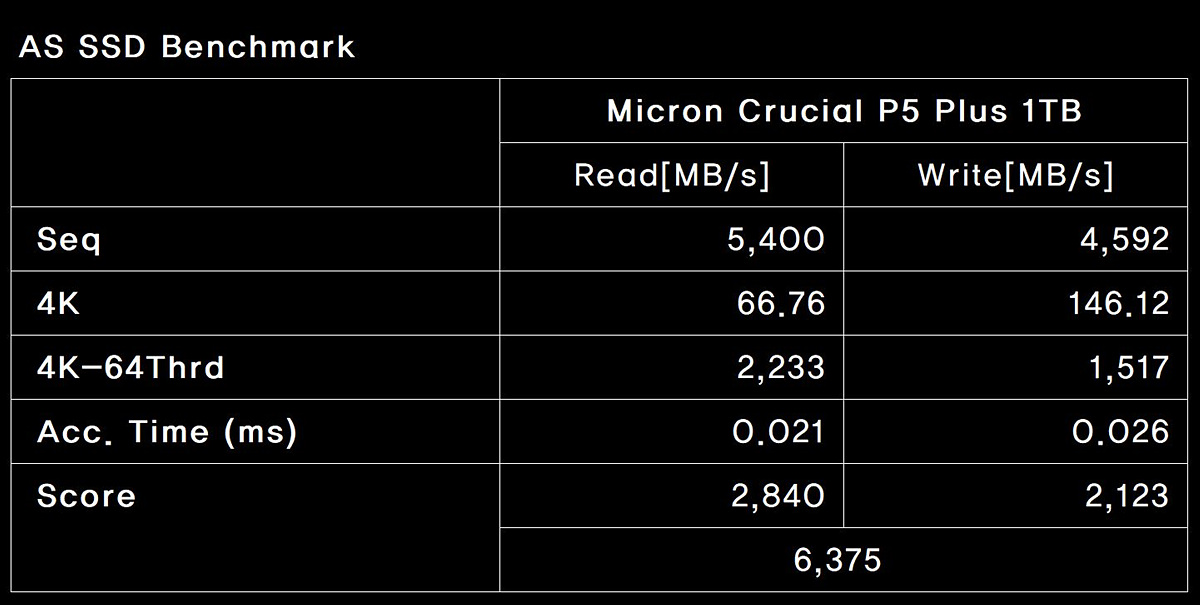 마이크론 제품이 AS SSD 쓰기 테스트에서는 점수가 조금 낮은 편인데 P5 Plus 역시 비슷한 모습이었습니다. 순차(Seq) 성능은 괜찮았지만 4K 쓰기 테스트는 다른 수치에 비해 조금 낮았습니다.