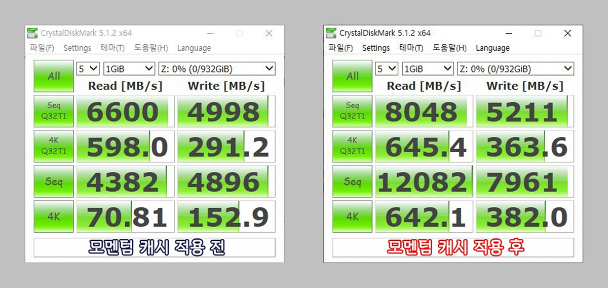 모멘텀 캐시를 사용하면 벤치 성능이 비약적으로 올라가지만 실제적으로 속도가 빨라지는 건 아닙니다. 여기서 측정되는 속도는 SSD가 아닌 RAM에 상주된 데이터로 측정을 한 부분이라 실제 사용과는 무관한 속도입니다. 개인적으로는 이런 부가 기능은 추천하지 않습니다.