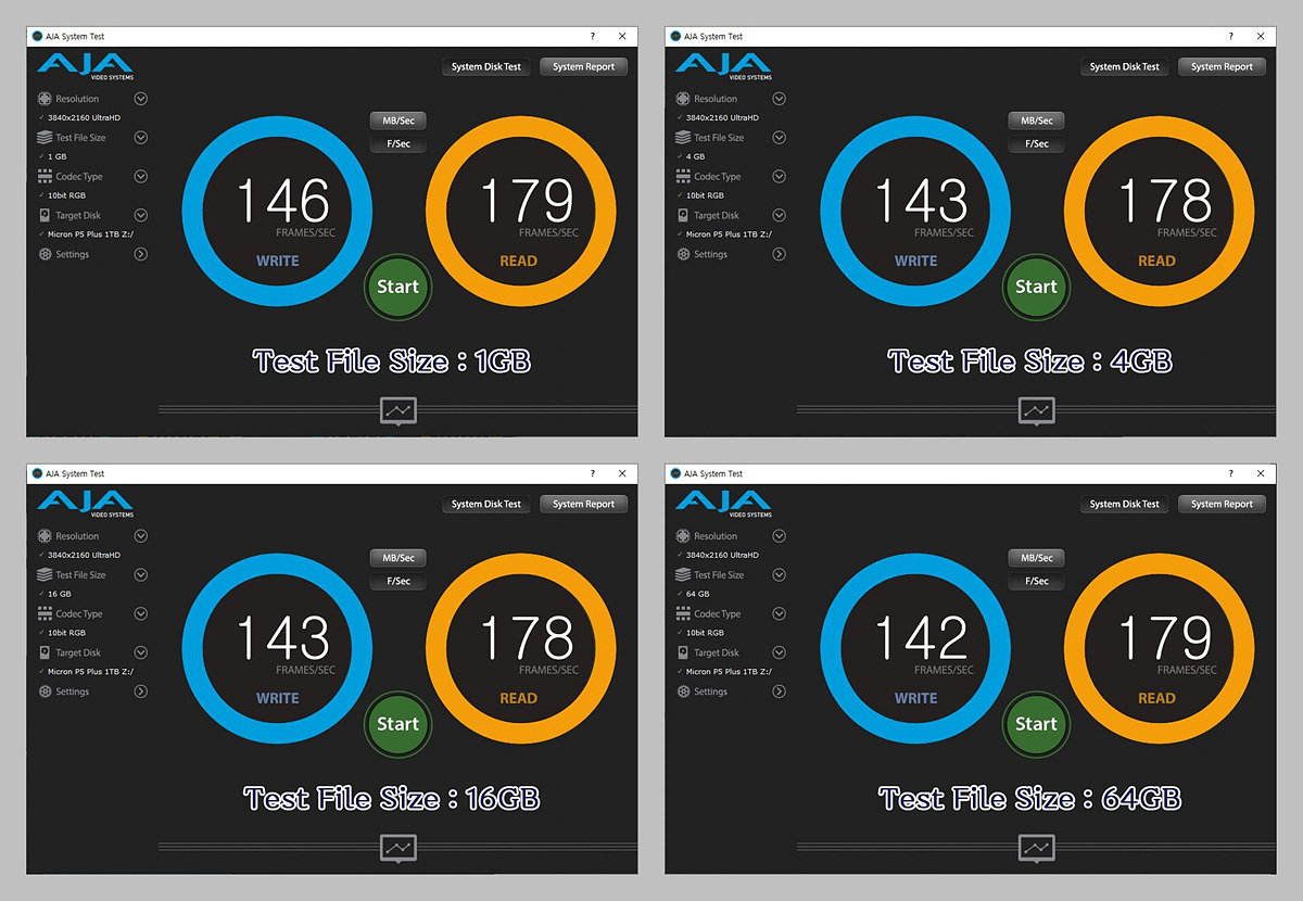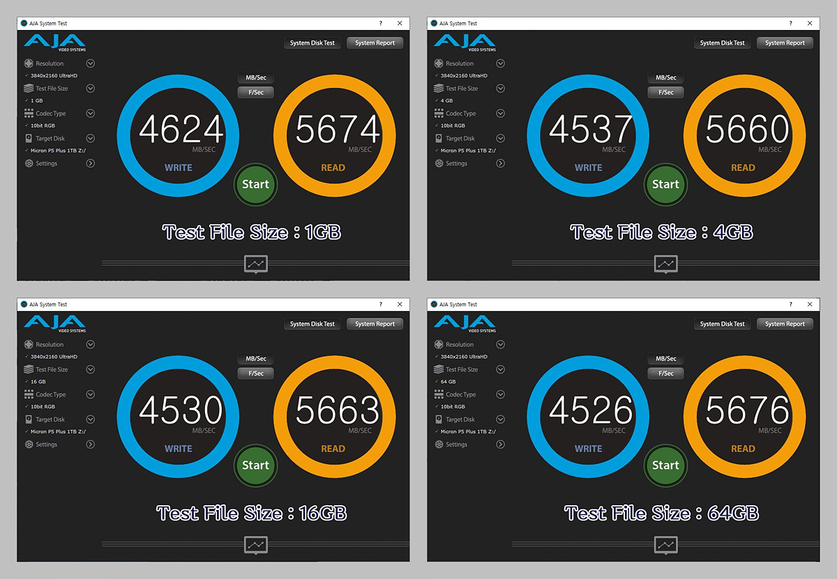 랜더링에 관련된 부분을 측정하는 AJA 벤치는 UHD / sRGB 100%를 기준으로 하였으며 1GB / 4GB / 16GB / 64GB 파일의 크기별로 각각 측정하였습니다.