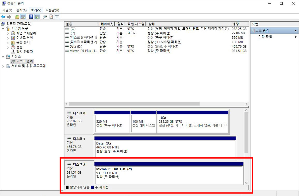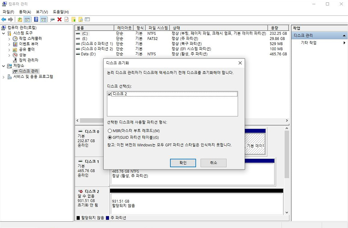 내장형 저장 장치들은 장착한 뒤 디스크 할당과 초기화(포맷)를 해주어야 정상적으로 사용할 수 있습니다. MBR / GPT 파티션은 원하는 대로 사용하시면 됩니다.