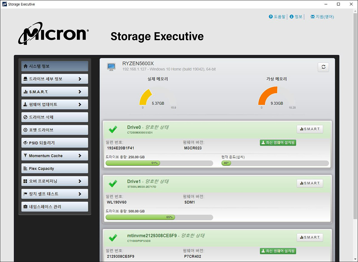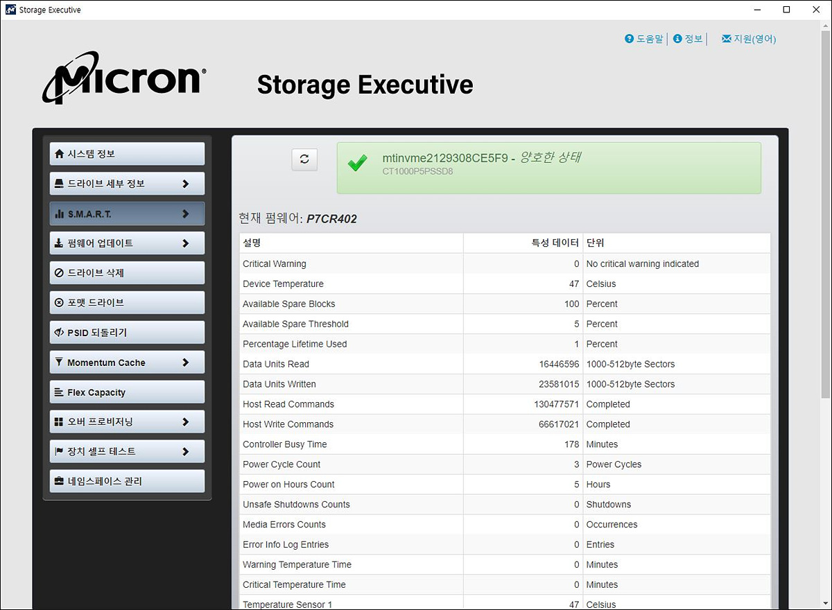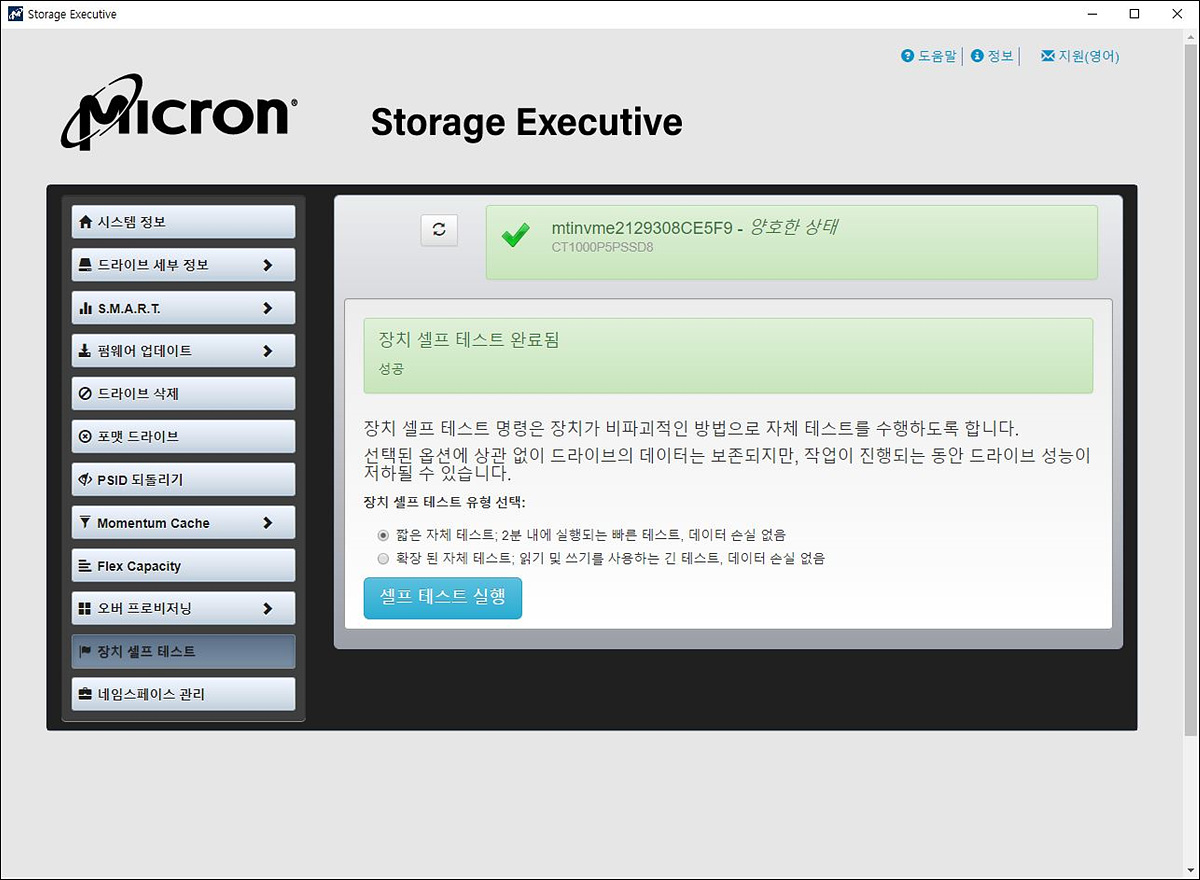 마이크론 SSD의 확인과 관리를 할 수 있는 Storage Executive입니다.