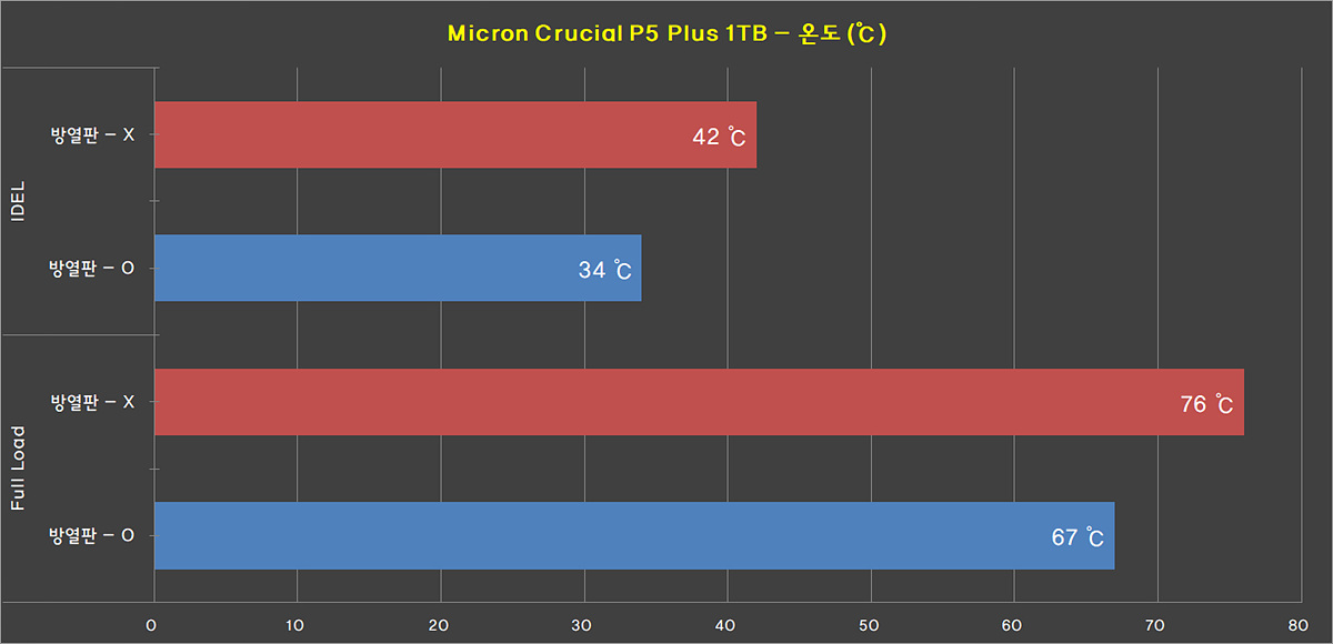 P5 Plus SSD의 온도는 메인보드의 방열판을 장착한 상태와 제거한 상태에서 각각 측정을 했습니다. 방열판을 장착한 상태에서는 67℃가 최고였지만 장착하지 않은 상태에서는 76℃를 기록하였습니다. 테스트를 해보니 이 76℃ 정도를 한계값으로 설정해둔 거 같더군요. 76℃가 되면 속도가 떨어지는 쓰로틀링이 걸리면서 다시 온도가 떨어지고 사용량이 늘어나면 온도가 올라가는 현상이 반복됐습니다.