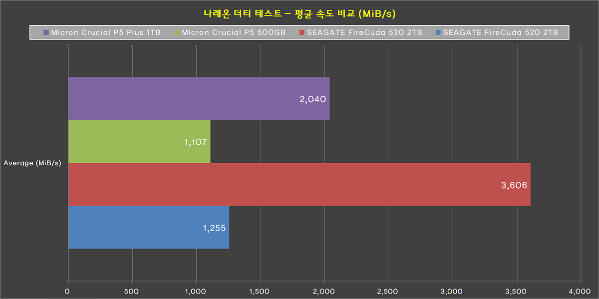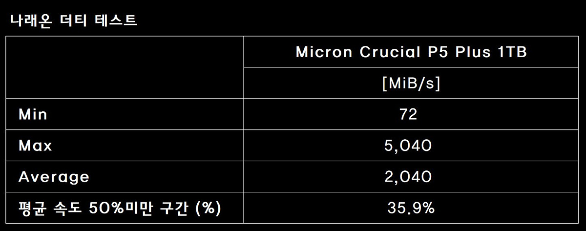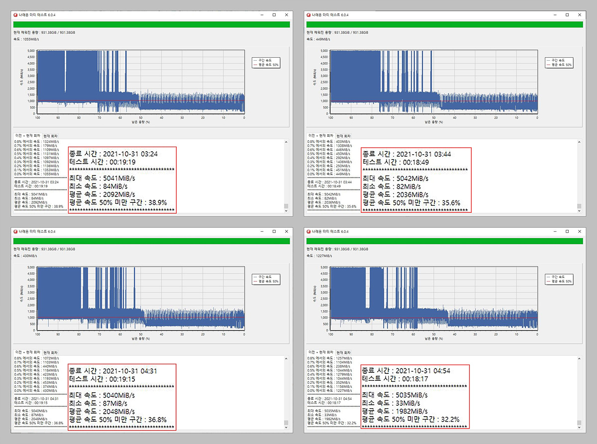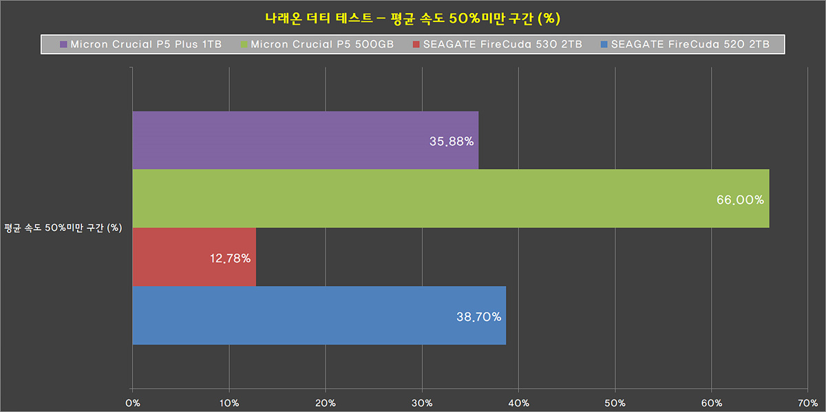 50% 미만 수치만 본다면 높을 수 있지만 나래 테스트는 이 부분과 함께 평균과 전체 테스트에 걸리는 시간 모두를 봐야 합니다. 1TB를 기준으로 18분 ~ 19분대로 살짝 아쉬운 정도라고 생각합니다.