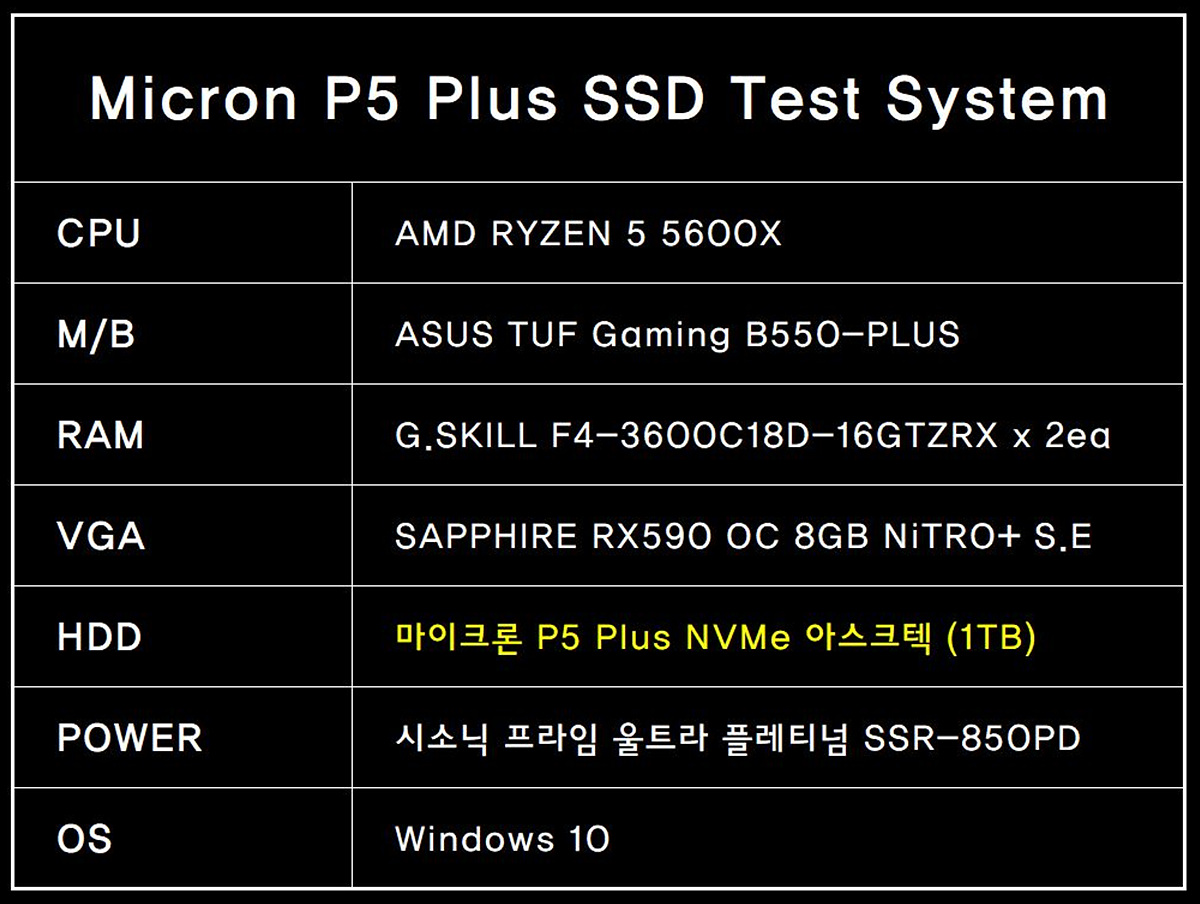 테스트에 사용된 시스템의 사양이며 마이크론 P5 Plus를 측정할 벤치마킹 S/W는 Crystal Disk Mark / AS SSD / HD Tune Pro / 나래온 더티 테스트 / AJA 총 다섯 가지입니다.