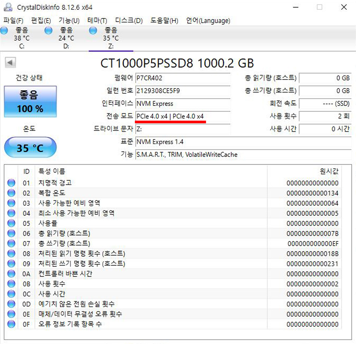 Crystal Disk Info를 통해 P5 Plus의 스펙(PCIe 4.0)과 상태를 확인할 수 있습니다.