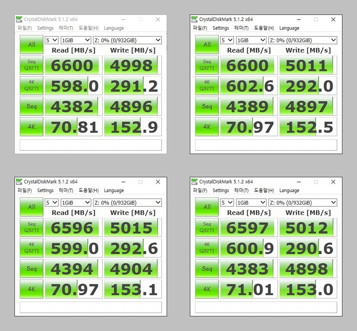 Crystak Disk Mark를 네 번 측정한 평균값입니다. P5 Plus이 최대 스펙인 6,660MB/s, 5,000MB/s를 만족하는 성능을 보여주었으며 PCIe 4.0 제품답게 4K의 성능이 많이 올라갔습니다.