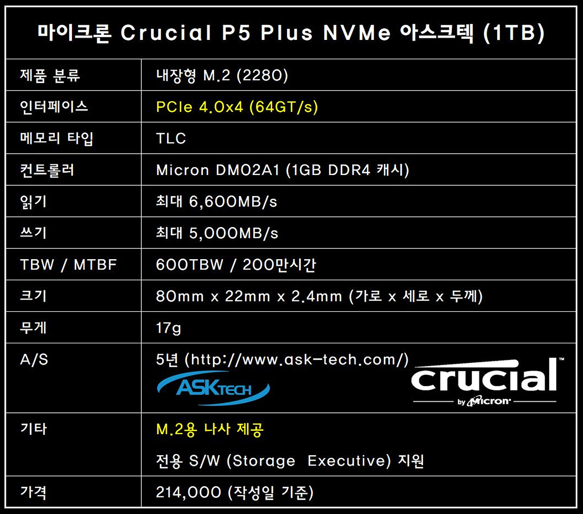 요즘 SSD 시장에서 가장 핫(Hot)한 주제는 PCIe 4.0 제품들입니다. 각 브랜드마다 꽤나 다양한 신제품들을 출시하고 있으며 특히나 PS5의 펌웨어 업데이트로 인해 PCIe 4.0을 지원하는 SSD의 수요 역시 빠르게 늘어나고 있습니다. 이번 시간에 소개하는 마이크론의 P5 Plus SSD 역시 PCIe 4.0을 지원하는 제품으로 데스크탑이나 노트북은 물론 PS5에서도 사용할 수 있는 빠른 속도를 가지고 있습니다.