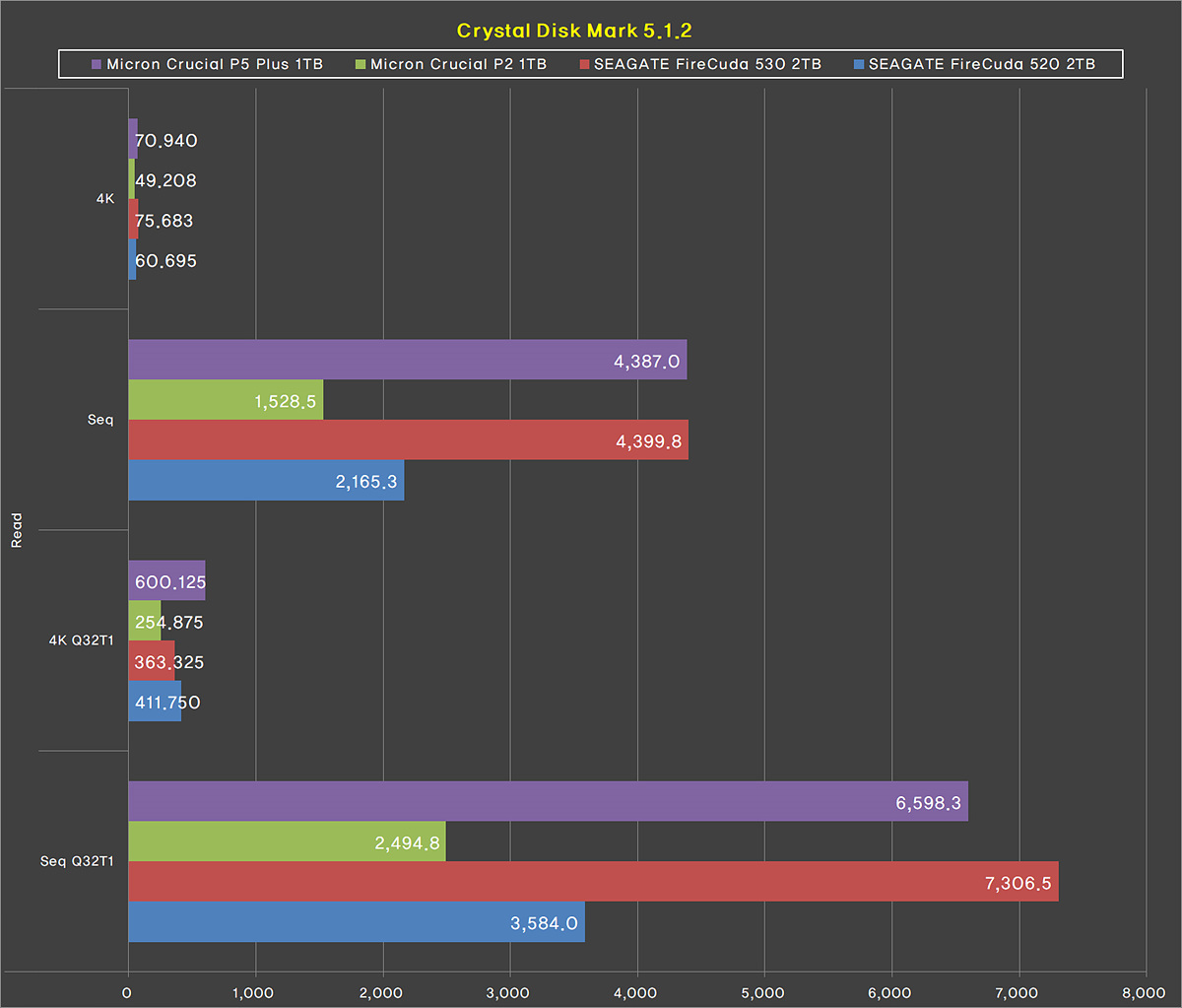 읽기 성능으로는 현재 최고의 스펙을 가지고 있는 Firecuda 530 제품과 거의 비슷한 속도를 보여주고 있으며 이전 제품인 P5보다는 두배가 넘는 수치입니다.