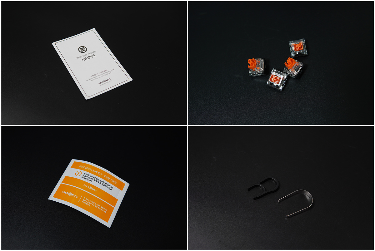 키보드, 키보드 커버, 한글 설명서, 키캡 리무버, 스위치 리무버, 4개의 추가 스위치가 포함되어 있습니다. 보통은 스위치를 한 개만 넣어주는데 X50은 4개로 제법 많은 편이라 좋았습니다.