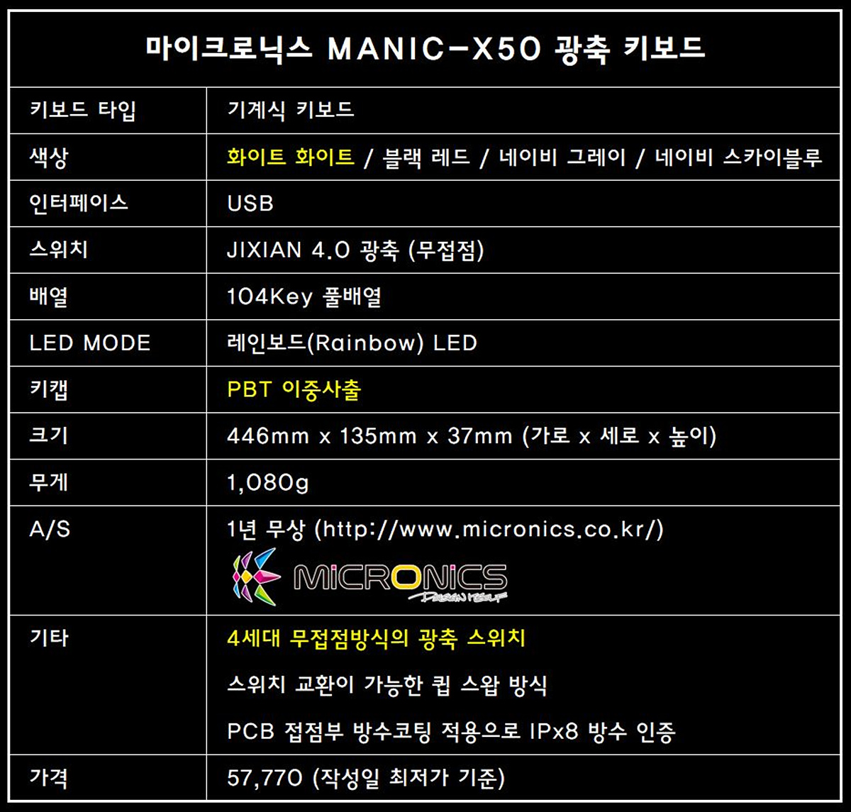 일반 사용자들의 기계식 키보드 보급률도 많이 높아졌지만 PC방에서는 거의 100%라고 할 정도로 기계식 키보드의 보급률이 엄청나게 높은 편입니다. 그래서인지 "기계식 키보드 = 게이밍 키보드"라는 인식까지 생기게 되었습니다. 일반적인 키보드들과 달리 PC방에서 사용하는 제품들은 훨씬 더 극한(?)의 상황에서 사용되고 있기 때문에 좀 더 높은 내구성을 필요로 합니다. 이런 상황에서는 빠른 스위치 교환은 물론 강력한 방수를 지원하는 광 스위치를 이용한 키보드가 제격입니다. 이번 시간에 소개하는 마이크로닉스의 MANIC X50은 이런 요구에 딱 맞는 무접점 방식의 광 스위치를 이용한 기계식 키보드입니다.