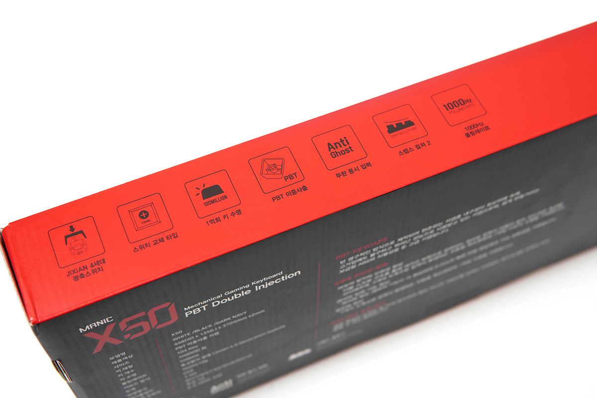 X50은 JIXIAN 4세대 광(光) 스위치를 사용했지만 이 제품의 가장 큰 특징은 스위치가 아닌 키캡입니다. 광 스위치를 사용한 키보드뿐 아니라 보급형 라인의 키보드들은 ABS 재질에 이중사출 방식을 사용하지만 X50은 PBT 재질의 키캡을 사용하고 있습니다. 키캡의 재질에 따라 키감이 달라지지는 않지만 번들거림을 훨씬 줄여줄 수 있습니다. 유분이나 내마모성이 좋은 것도 있지만 손가락으로 만져보면 약간 까끌까끌한 특유의 느낌 때문에 ABS보다 PBT 재질의 키캡을 더 좋아합니다. 키보드의 외형이나 기능 그리고 타건감에 대해 자세하게 살펴보도록 하겠습니다.
