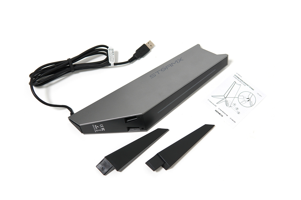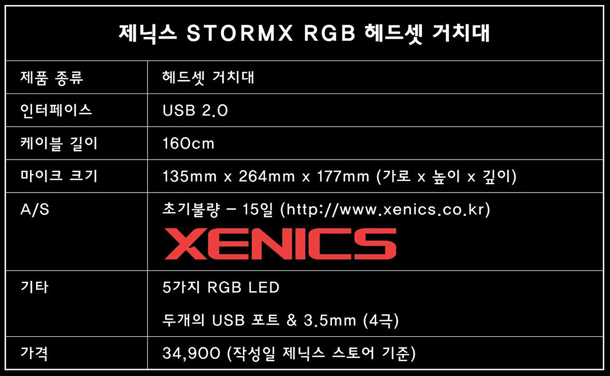 제품의 스펙을 간단히 정리해보았습니다. LED는 5가지 모드로 조절이 가능하며 원하지 않을 경우 끌 수도 있습니다. USB 2.0 포트 두 개가 있어서 키보드나 마우스, 게임 컨트롤러와 같은 입력 장치를 연결할 수 있습니다. 3.5mm 커넥터는 4극으로 되어있어서 3.5mm 헤드셋이나 이어폰을 연결해서 사용할 수 있습니다. 여러 가지 부가 기능이 있어서 헤드셋을 단순히 거치만 하는 제품보다 가격은 조금 높은 편입니다. 제닉스 STORMX 거치대의 외형이나 기능에 대해 자세하게 살펴보도록 하겠습니다.