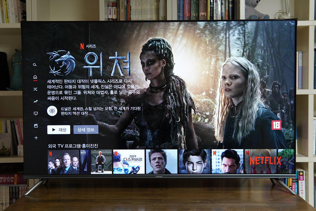 더함 TA554-AVN221C는 안드로이드 OS를 사용해서 스마트 TV라는 이름값을 톡톡히 하는 제품이었습니다. 이전에 사용했던 우분투(리눅스)를 사용한 스마트 TV와는 비교할 수 없을 만큼 뛰어난 성능을 보여주었습니다. 스마트폰이나 태블릿만큼 빠릿빠릿하지는 않지만 구동이 느려서 불편하거나 답답하다고 느껴지지는 않았습니다. OTT(넷플릭스, 디즈니, 왓챠), 콘솔 게임기, PC와 연결해서 사용할 수 있는 확장성 역시 만족스러웠습니다. 돌비 비전과 애트 모스를 이용한 영상, 사운드 효과 역시 넷플릭스의 신작을 볼 때는 확실한 효과를 보여주었습니다.