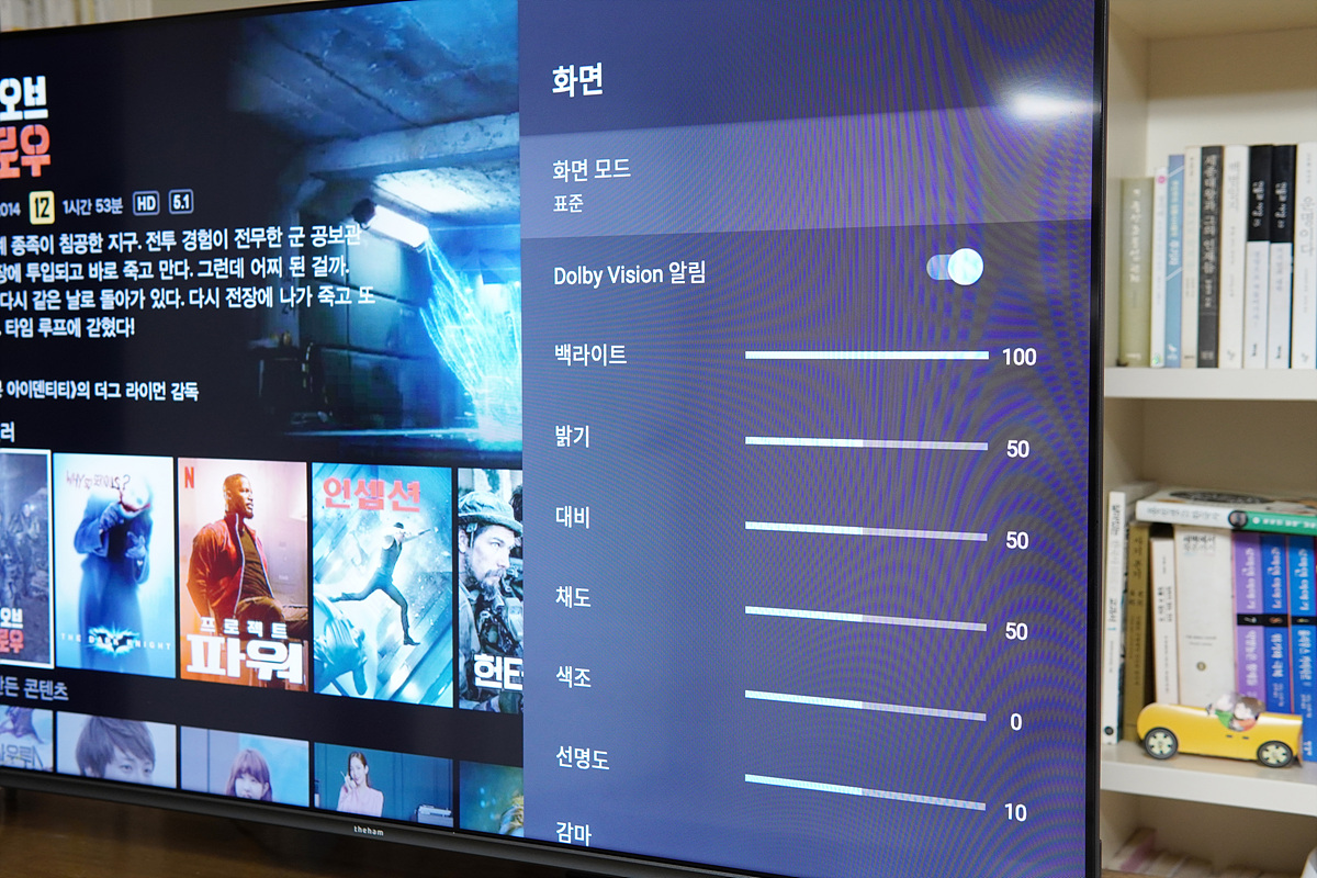 4K 화질은 역시나 만족스러웠으며 색감은 쨍~~ 한 느낌보다는 부드럽고 화사한 느낌으로 VA패널의 특징을 확실히 느낄 수 있었습니다. 사용된 패널에 대한 정확한 정보는 확인할 수 없었지만 설정에서 색상 조절이 가능하고 무엇보다 돌비 비전(Dolby Vision)을 사용할 수 있다는 장점이 있습니다.