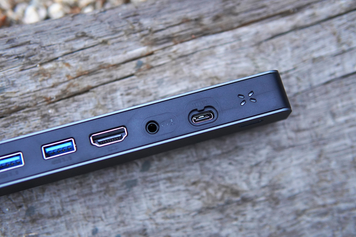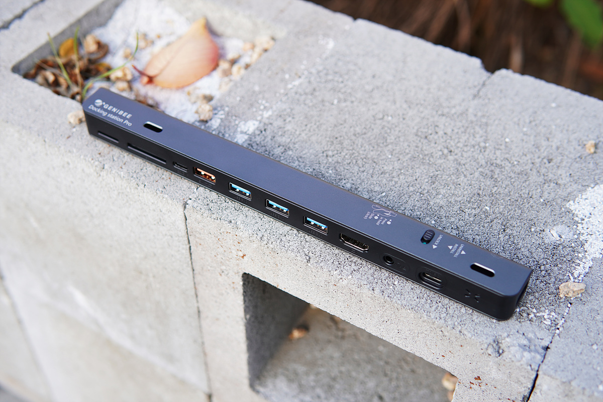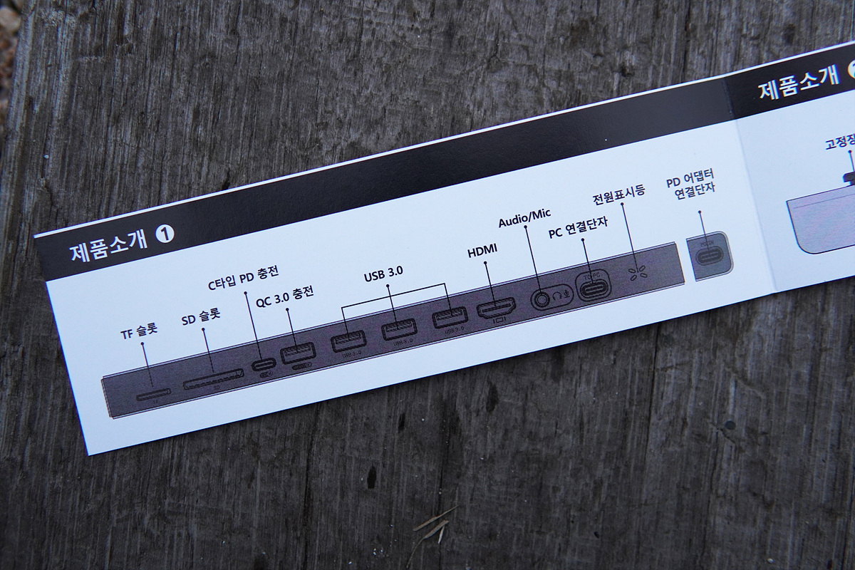허브는 11개의 포트가 있으며 오른쪽 두 개 (PC 연결, PD 어댑터)를 제외한다면 총 9개의 포트를 확장할 수 있습니다. USB 포트는 모두 3.0이며 왼쪽의 QC 3.0 포트는 데이터가 아닌 충전 전용입니다.