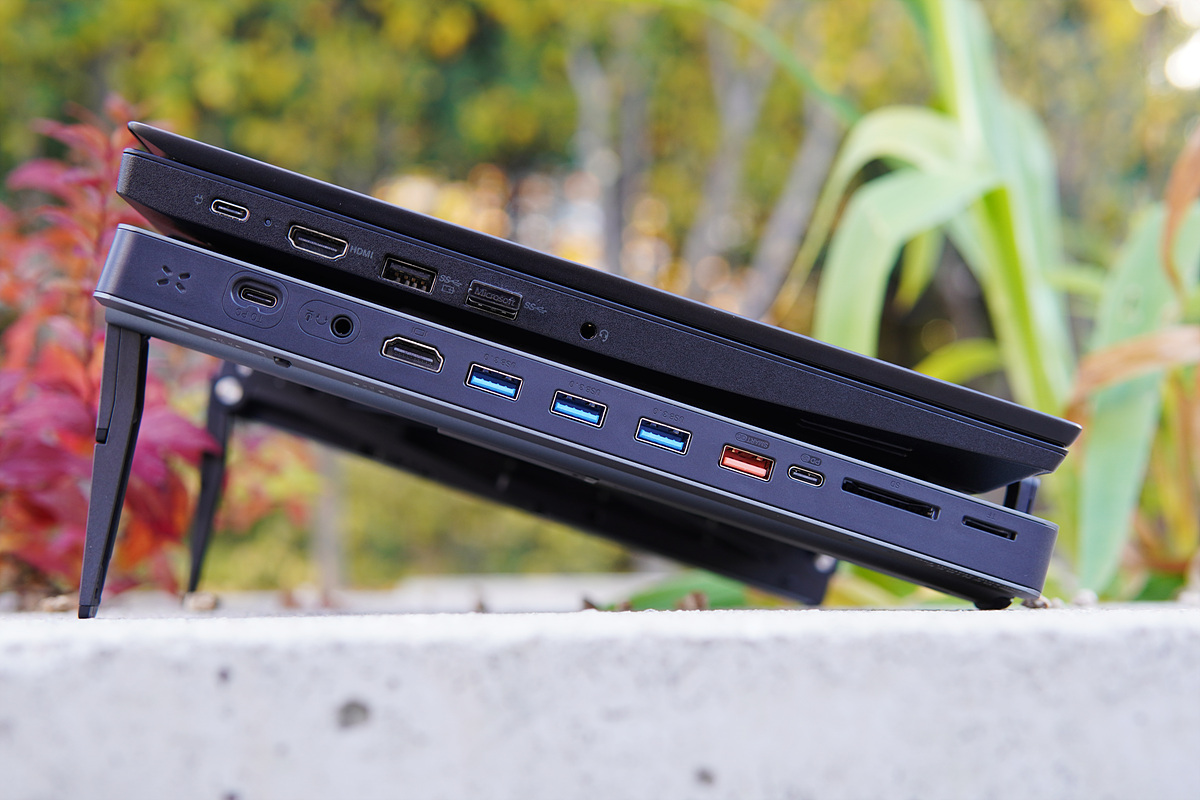 3개의 USB, HDMI, 사운드를 사용할 수 있는 9개의 확장 포트와 두 개의 충전 포트로 노트북에서 부족한 확장성을 채울 수 있는데 유선 LAN 포트가 없는 게 아쉬웠습니다. 오른쪽 측면의 Type-C 포트는 노트북의 충전에 사용할 수 있는 전원으로 최대 100W까지 사용할 수 있으니 출력이 높은 게이밍 노트북에서도 사용할 수 있습니다.