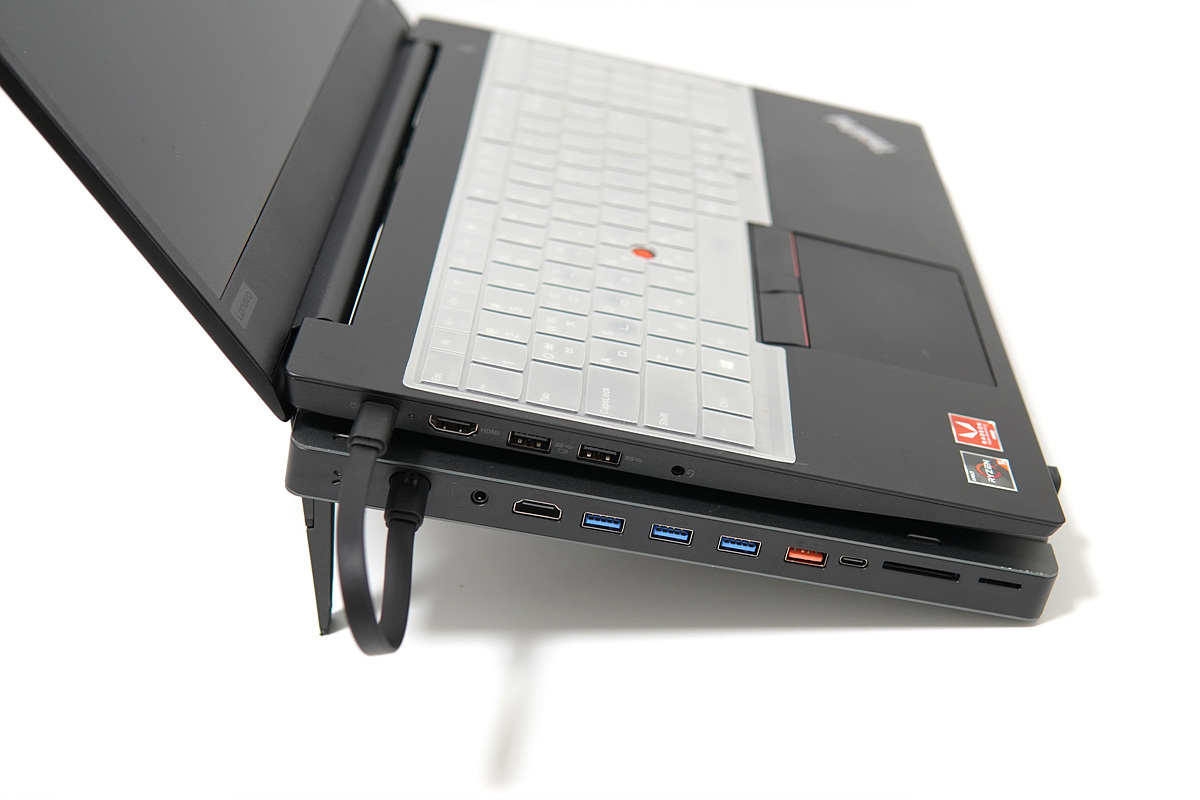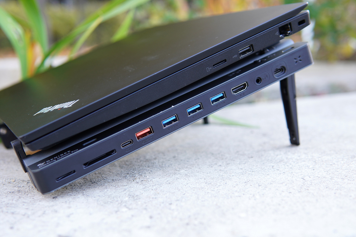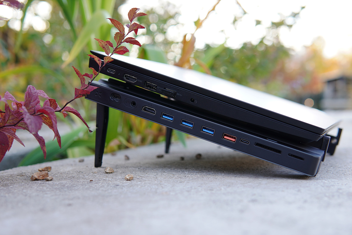 3개의 USB, HDMI, 사운드를 사용할 수 있는 9개의 확장 포트와 두 개의 충전 포트로 노트북에서 부족한 확장성을 채울 수 있는데 유선 LAN 포트가 없는 게 아쉬웠습니다. 오른쪽 측면의 Type-C 포트는 노트북의 충전에 사용할 수 있는 전원으로 최대 100W까지 사용할 수 있으니 출력이 높은 게이밍 노트북에서도 사용할 수 있습니다.