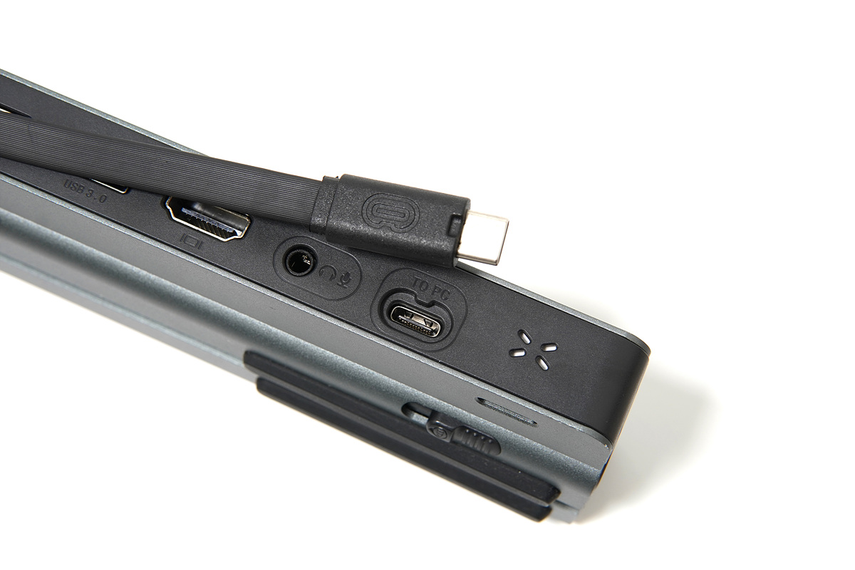 오른쪽에 있는 Type-C 포트는 PC나 노트북에 연결이 됩니다. Type-C 포트가 총 3개가 있어서 조금 다른 모양으로 포인트를 주고 있으며 각각의 포트에는 이름이 표시되어 있습니다.