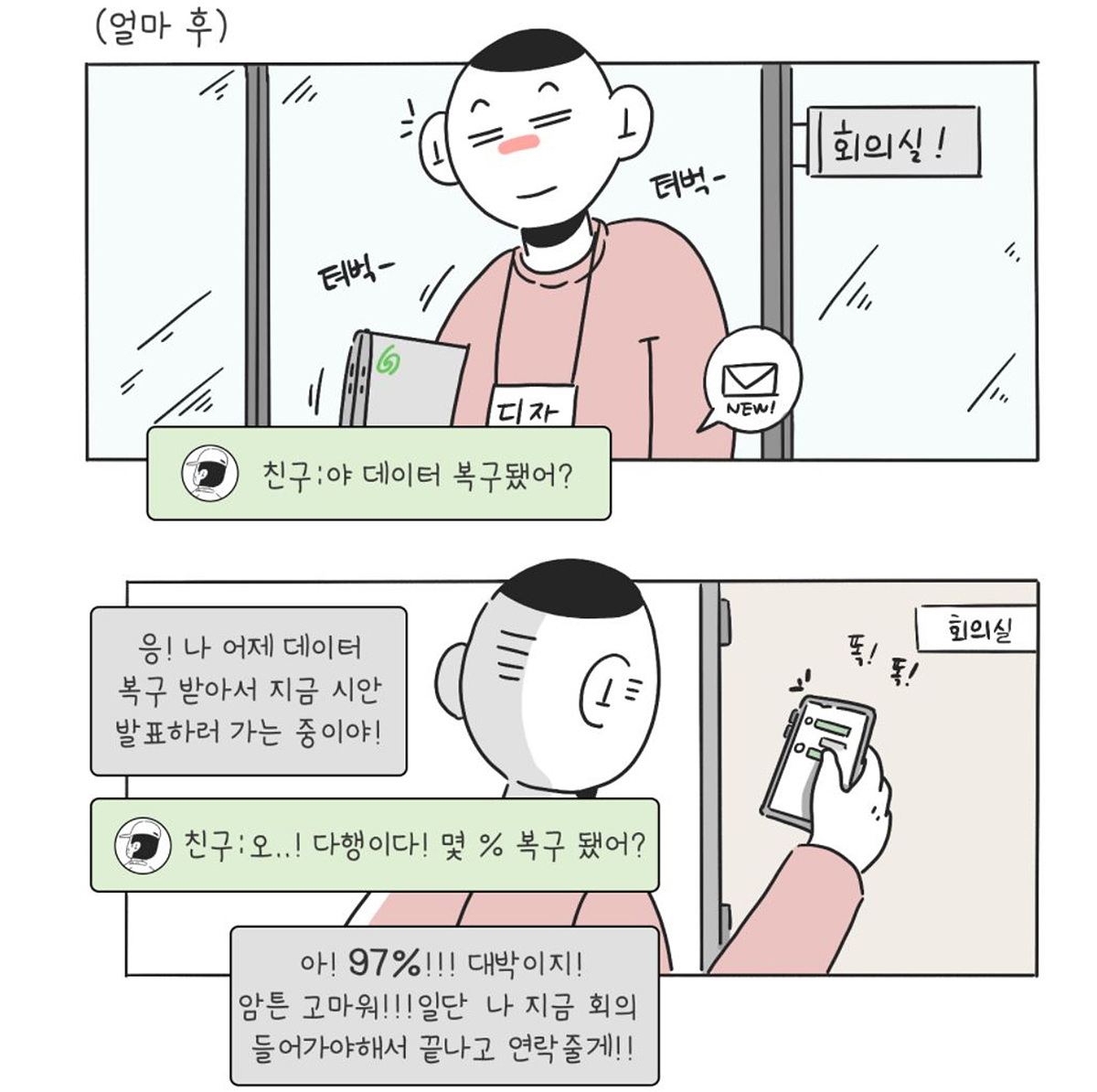 저장장치(SSD, HDD)에서 안정성은 기본이지만 OS, 게임을 실행하는 기기와는 다르게 데이터를 보관하는 용도에서는 이런 안정성은 더더욱 중요합니다. 하지만 아무리 안정성이 좋은 제품이라도 사용 중 불량이나 파손의 위험은 항상 있습니다. PC 안에 설치되는 내장 방식이 아닌 가지고 다니는 휴대용 저장장치는 이런 위험이 더 높아지게 됩니다. 저장장치의 이상이 있을 때는 하드웨어적인 부분보다 그 안에 담겨있는 데이터로 인해서 더욱 멘붕에 빠지게 됩니다.