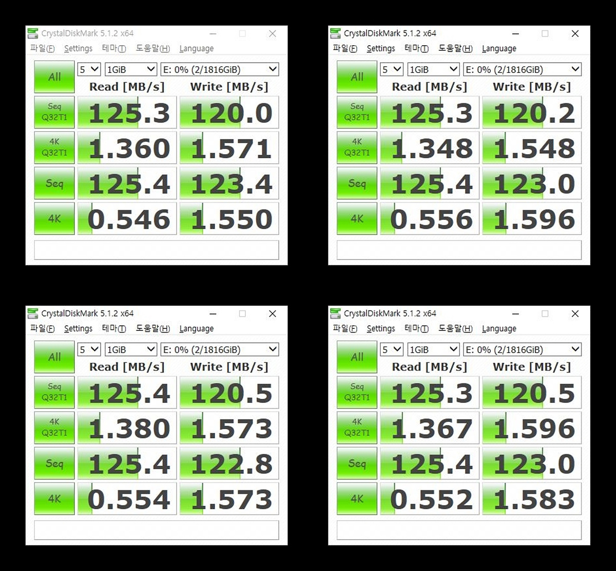 Crystal Disk Mark로 속도를 테스트해보았습니다. 이전 리뷰에서나 커뮤니티에서 답변을 할 때도 자주 언급을 했던 부분인데 개인적으로 이제 HDD(내장/외장 모두)의 속도는 크게 중요하지 않다고 생각합니다. 의미 없다는 게 아니라 속도를 생각한다면 HDD보다는 SSD로 구입을 하는 게 더 좋다는 뜻입니다.