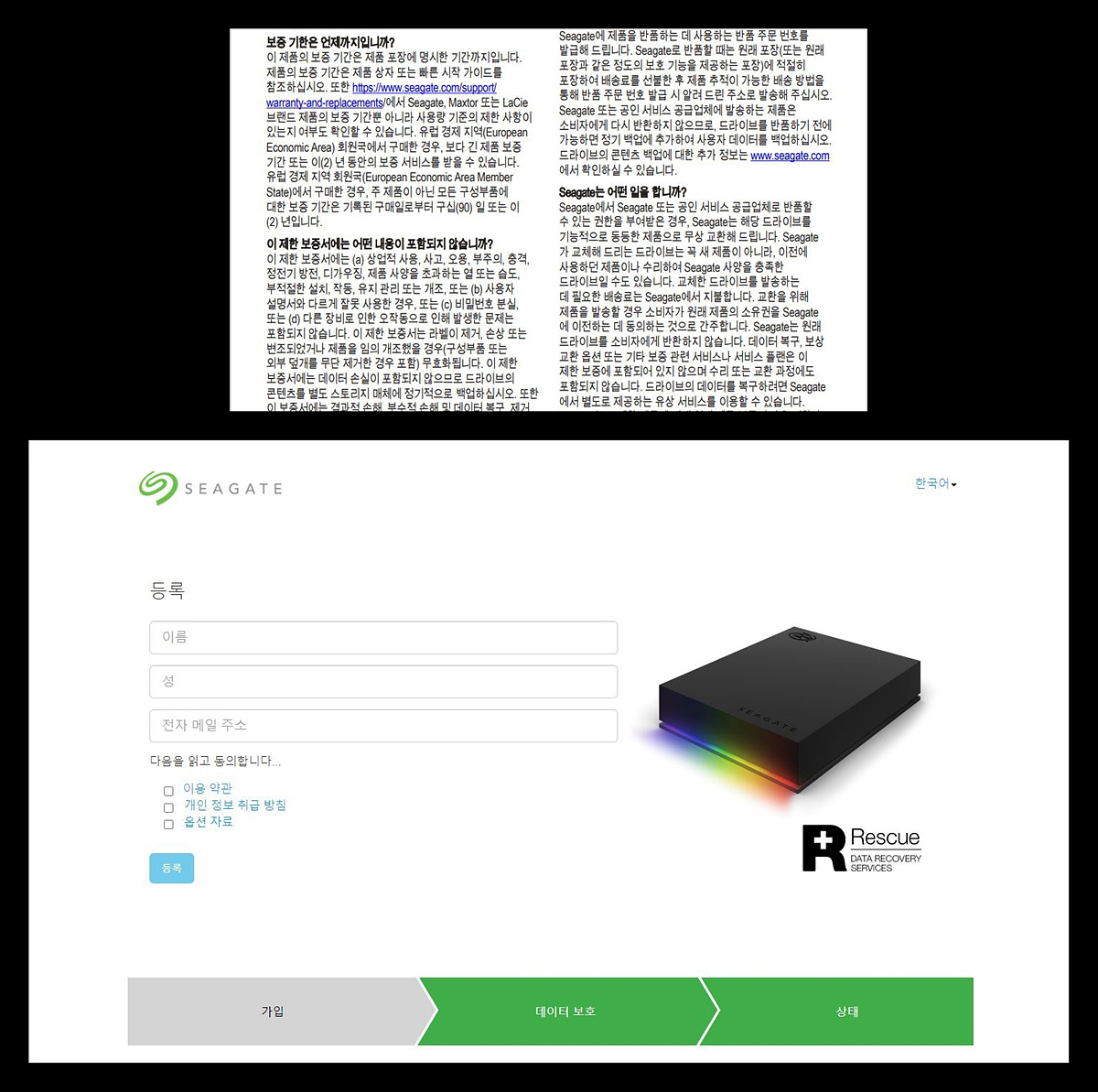 이런 상황에 대비해서 씨게이트에서는 레스큐 데이터 복구 서비스를 지원하고 있습니다. 씨게이트 제품을 소개할 때마다 언급하는 부분인데 제조사의 연구소에서 직접 데이터 복구를 진행하기 때문에 더욱더 안심할 수 있습니다. 씨게이트 발표에 따르면 HDD, SSD 모두 포함해 95% 이상의 높은 복구율을 보이고 있습니다. 복구 서비스는 무료로 진행이 되며 물리적인 고장과는 조금 다르게 3년 동안 1회 지원을 받을 수 있습니다. 데이터 복구 서비스를 받아본 분들이라면 아시겠지만 이 비용은 정말 어마어마하게 비싼 편입니다. 한번뿐이지만 그래도 이런 서비스를 무료로 받게 되면 제품의 가격은 전 혀 아깝지 않은 엄청난 장점이자 혜택입니다.