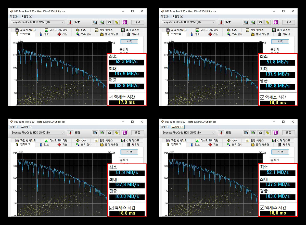 씨게이트 파이어쿠다 Gaming HDD 데이터복구 제품은 다른 외장 HDD에 비해 4K의 읽기 속도가 좋은 편이지만 반대로 4K 쓰기에서는 좀 약한 모습을 보여주고 있습니다. 같은 HDD에서의 비교이지 SSD와 비교하면 의미가 없는 수치이니 참고해주세요. ^^
