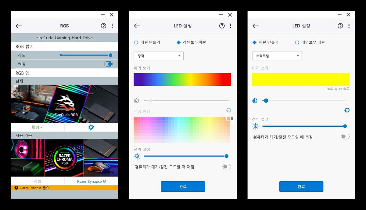 씨게이트 파이어쿠다 Gaming HDD 데이터복구 외장 HDD에서 핵심적인 부분이라고 할 수 있는 RGB LED를 설정할 수 있는 부분입니다. RGB나 단색으로 설정을 할 수도 있고 원하지 않으면 LED를 끌 수도 있습니다. 레이저 게이밍 기어를 사용하는 분들이라면 크로마(Chroma)와 동기화할 수 있다는 게 큰 매력입니다.