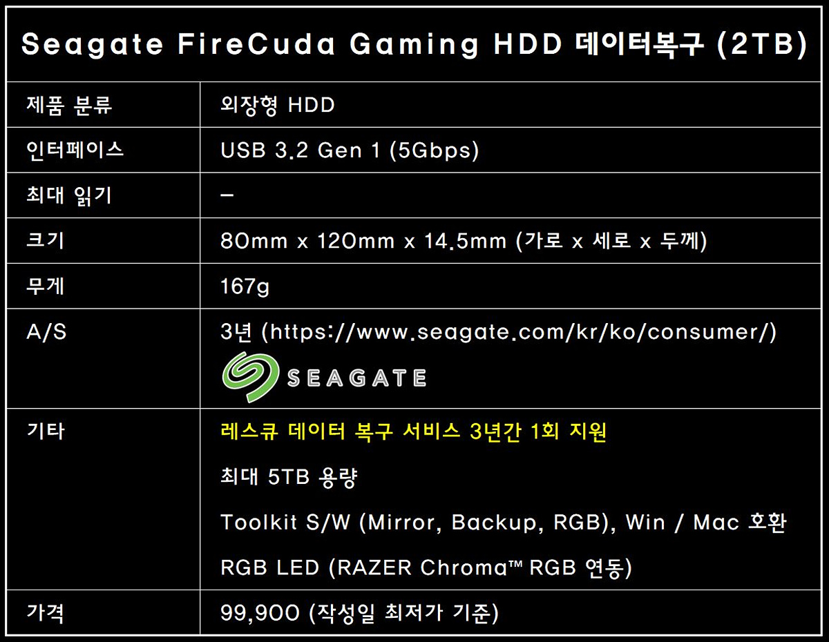 제품의 스펙을 간단히 정리해보았습니다. 파이어쿠다 Gaming HDD 데이터복구 제품의 가장 큰 특징은 제품의 이름처럼 "레스큐 데이터 복구 서비스"를 제공한다는 점입니다. 단순히 이 제품뿐만 아니라 씨게이트 브랜드의 모든 제품들이 가지고 있는 가장 큰 특징이자 장점이라고 할 수 있죠. 최대 5TB의 용량을 지원하고 있으며 이번에 소개하는 제품은 2TB 용량입니다.