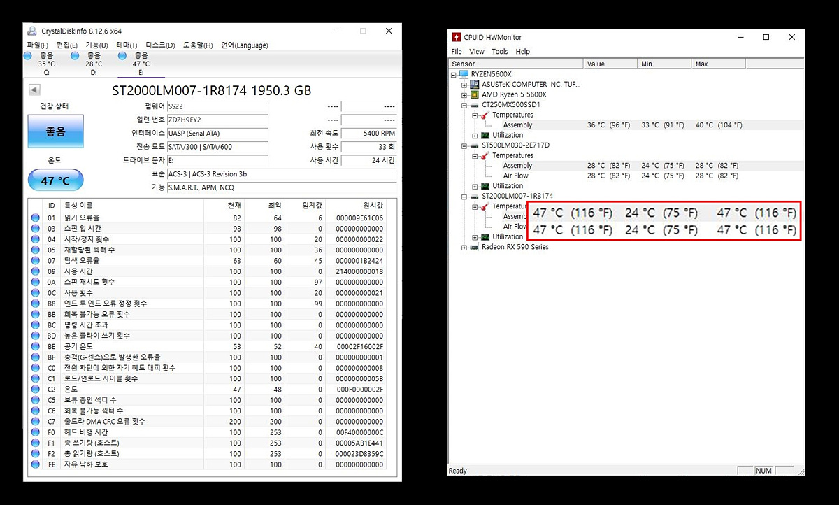 테스트 중 가장 높은 온도는 47℃로 측정이 되었습니다.