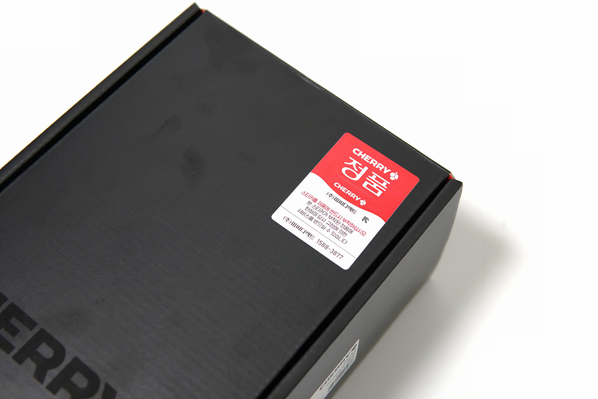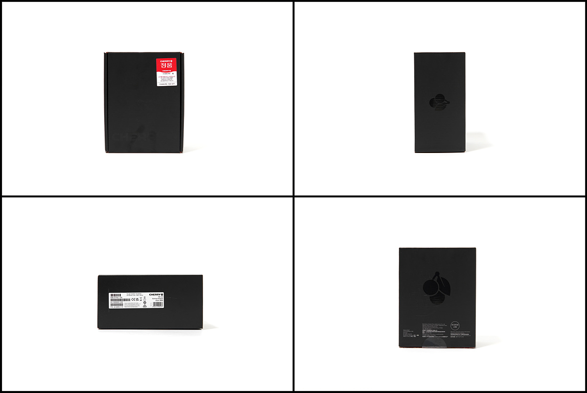 체리 키보드가 생각나는 검은색 박스와 체리 로고만 있는 박스 포장입니다.